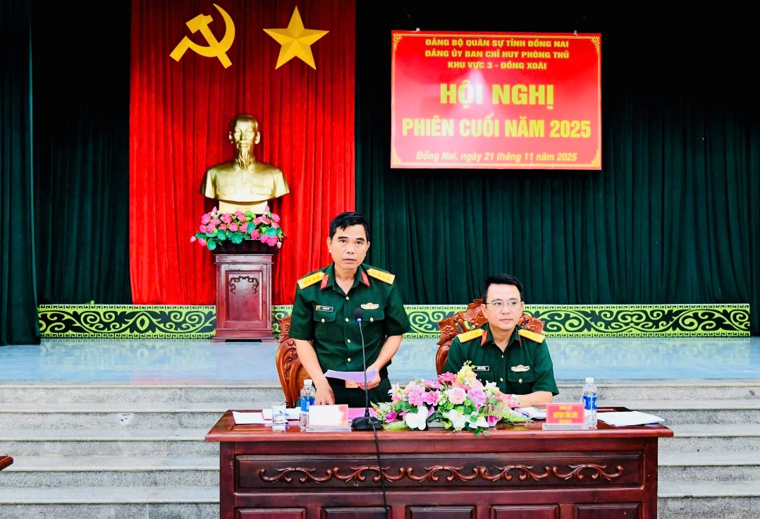 Ngày 21-11, Đảng ủy Ban Chỉ huy phòng thủ Khu vực 3 đã tổ chức Hội nghị phiên cuối năm 2025, nhằm đánh giá toàn diện kết quả thực hiện nhiệm vụ quân sự – quốc phòng trong năm và đề ra phương hướng, mục tiêu cho năm 2026. Đến tham dự và chủ trì Hội nghị có các đồng chí: Đại tá Bùi Văn Sỹ, Ủy viên Ban Thường vụ Đảng ủy Quân sự tỉnh, Phó Chính ủy Bộ Chỉ huy Quân sự tỉnh; Thượng tá Huỳnh Tấn Lực, Bí thư Đảng ủy, Chính ủy Ban Chỉ huy phòng thủ Khu vực 3 - Đồng Xoài; cùng Bí thư Đảng ủy Quân sự các xã, phường thuộc khu vực phòng thủ.