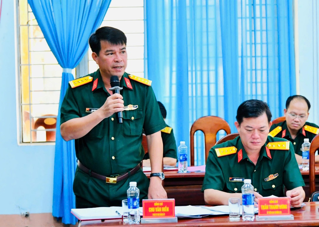 Đại tá Chu Văn Hiền, Phó Bí thư Đảng ủy, Chỉ huy trưởng Ban Chỉ huy khu vực 3 - Đồng Xoài phát biểu tại Hội nghị (Ảnh: Minh Đắc - Minh Tiến)
