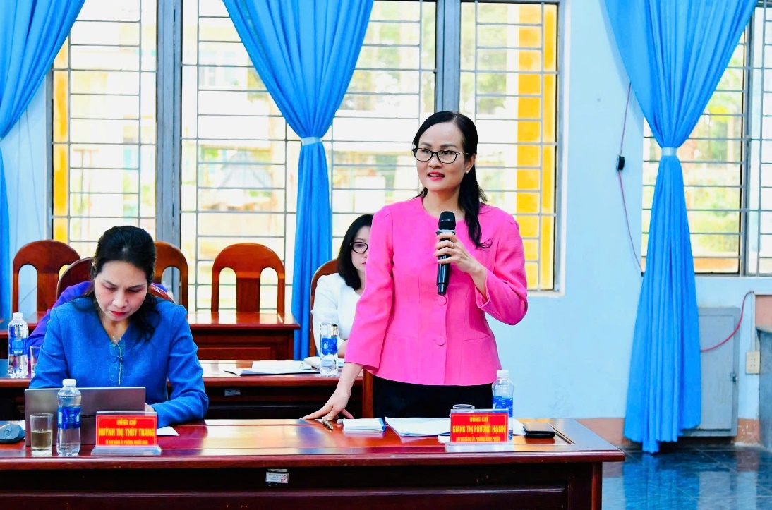 Đồng chí Giang Thị Phương Hạnh, Ủy viên Ban Thường vụ Tỉnh ủy, Bí thư Đảng ủy, Chủ tịch HĐND Phường Bình Phước phát biểu tại Hội nghị (Ảnh: Minh Đắc - Minh Tiến)