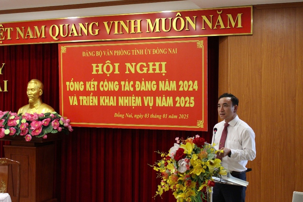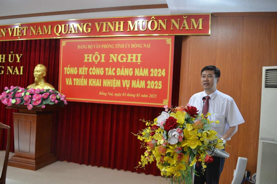 Tại Hội nghị, đồng chí Nguyễn Xuân Cường, Phó Bí thư Đảng ủy VPTU trình bày tóm tắt Báo cáo tổng kết công tác Đảng năm 2024 và Nghị quyết của Ban Chấp hành Đảng bộ năm 2025, theo đó, Đảng ủy VPTU đã lãnh đạo, chỉ đạo thực hiện tốt công tác tham mưu, phục vụ cho Tỉnh ủy, Ban Thường vụ Tỉnh ủy và Thường trực Tỉnh ủy trên các lĩnh vực công tác xây dựng Đảng, nội chính, kinh tế - xã hội, quốc phòng - an ninh, đối ngoại; chuẩn bị các nội dung, phục vụ cuộc họp tập thể Thường trực Tỉnh ủy, Ban Thường vụ Tỉnh ủy; hội nghị Ban Chấp hành Đảng bộ tỉnh. Phối hợp tham mưu Tỉnh ủy ban hành các văn bản thực hiện Chỉ thị số 35-CT/TW của Bộ Chính trị (khóa XIII) về “Đại hội đảng bộ các cấp tiến tới đại hội đại biểu toàn quốc lần thứ XIV của Đảng”; chuẩn bị nội dung cho Thường trực Tỉnh ủy làm việc với các đơn vị, địa phương theo quy chế. Tập trung lãnh đạo, chỉ đạo các chi bộ trực thuộc tổ chức thành công Đại hội chi bộ nhiệm kỳ 2025-2027; chuẩn bị tốt công tác xây dựng văn kiện và nhân sự Đại hội Đảng bộ nhiệm kỳ 2025-2030....