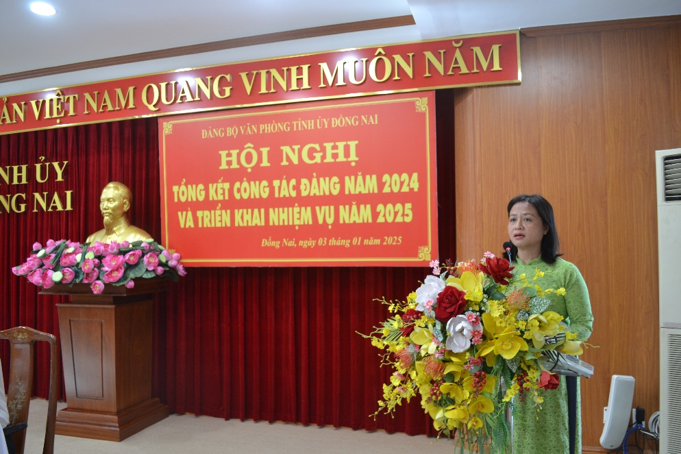 Phát biểu chỉ đạo Hội nghị, đồng chí Đoàn Thị Thu Thủy, Phó Bí thư Đảng ủy Khối các cơ quan tỉnh chia sẻ, khối lượng công việc của Văn phòng Tỉnh ủy rất lớn, nhiệm vụ chuyên môn nhiều và phát sinh nhiều nhiệm vụ, nhưng Đảng ủy Văn phòng Tỉnh ủy đã lãnh đạo thực hiện tốt nhiệm vụ chính trị của cơ quan và công tác xây dựng Đảng của Đảng bộ Văn phòng Tỉnh ủy; đồng chí Phó Bí thư Đảng ủy Khối các cơ quan tỉnh đề nghị, năm 2025, Đảng ủy Văn phòng Tỉnh ủy quan tâm lãnh đạo, tổ chức thực hiện có hiệu quả Kết luận số 01-KL/TW của Bộ Chính trị (khóa XIII) về tiếp tục thực hiện Chỉ thị số 05-CT/TW của Bộ Chính trị (khóa XII) và chuyên đề năm 2025 về học tập và làm theo tư tưởng, đạo đức, phong cách Hồ Chí Minh; tiếp tục thực hiện tốt việc nâng cao chất lượng tổ chức đảng và đảng viên, triên khai thực hiện mô hình "chi bộ bốn tốt", "đảng bộ cơ sở bốn tốt"; nâng cao chất lượng sinh hoạt đảng, sinh hoạt chuyên đề; xây dựng và triển khai thực hiện chương trình kiểm tra, giám sát ngay từ đầu năm và phân bổ thời gian thực hiện cụ thể hàng quý; tăng cường lãnh đạo, chỉ đạo UBKT Đảng ủy và các cấp ủy chi bộ trực thuộc triển khai thực hiện công tác kiểm tra, giám sát đảm bảo quy trình, quy định…