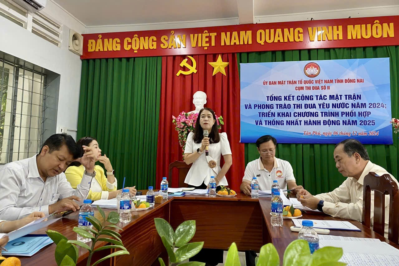 Sáng ngày 06/12/2024, Cụm thi đua số 2 Ủy ban MTTQ Việt Nam tỉnh Đồng Nai tổ chức tổng kết hoạt động cụm năm 2024, gồm các đơn vị: huyện Tân Phú, Định Quán, Thống Nhất, Vĩnh Cữu, Xuân Lộc và Cẩm Mỹ. Đơn vị Ủy ban MTTQ Việt Nam huyện Tân Phú là Cụm trưởng.