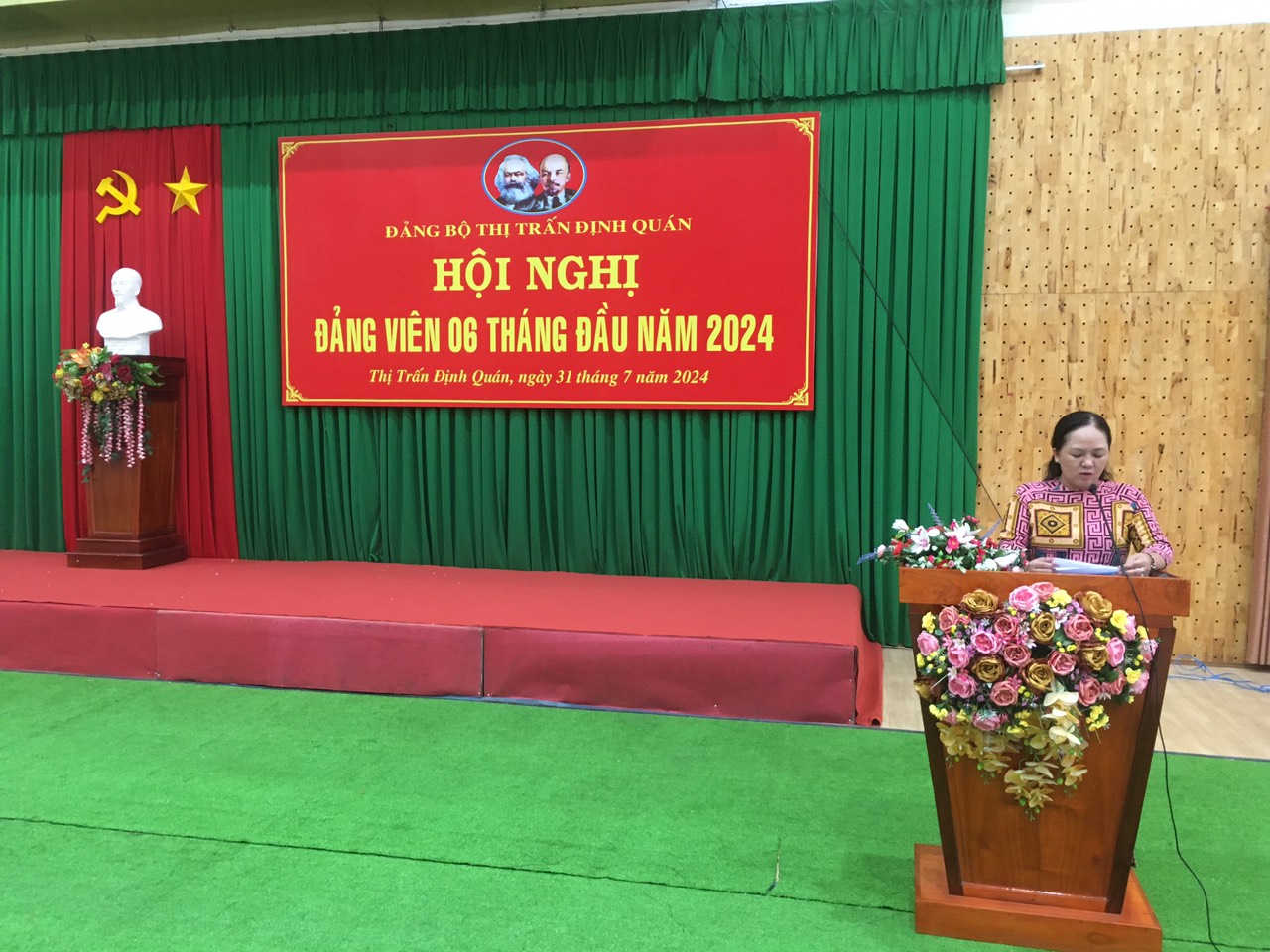 Trong 06 tháng qua, Đảng ủy thị trấn Định Quán thực hiện tốt công tác giáo dục chính trị tư tưởng cho đảng viên trong Đảng bộ, triển khai học tập, quán triệt Nghị quyết, Chỉ thị của Đảng đến 90% đảng viên (10% là đảng viên miễn sinh hoạt); tổ chức triển khai Nghị quyết 24-NQ/TW ngày 27/10/2022 về hướng dẫn sinh hoạt chuyên đề năm 2024, triển khai học tập chuyên đề sử dụng sổ tay đảng viên điện tử; triển khai hướng dẫn số 12-HD/BTCTU ngày 21/4/2024 của BTC Tỉnh ủy một số vấn đề nâng cao sinh hoạt Chi bộ ấp, khu phố; Quy đinh số 25-QĐ/TU ngày 13/02/2019 của Ban thường vụ Tỉnh ủy về tiêu chí đánh giá chất lượng sinh hoạt Chi bộ hàng tháng trong các cuộc họp giao ban, nhằm nâng cao chất lượng sinh hoạt Chi bộ và tiếp tục đẩy mạnh cuộc vận động “ Học tập và làm theo tư tưởng, đạo đức phong cách Hồ Chí Minh”; Công tác kiểm tra, giám sát của Đảng tiếp tục nâng cao chất lượng, hiệu quả, góp phần quan trọng vào việc nâng cao năng lực lãnh đạo, sức chiến đấu của Đảng, sự đoàn kết thống nhất và bảo đảm thực hiện dân chủ trong Đảng, giữ vững kỷ cương, kỷ luật của Đảng xây dựng tổ chức Đảng ngày càng trong sạch, vững mạnh.