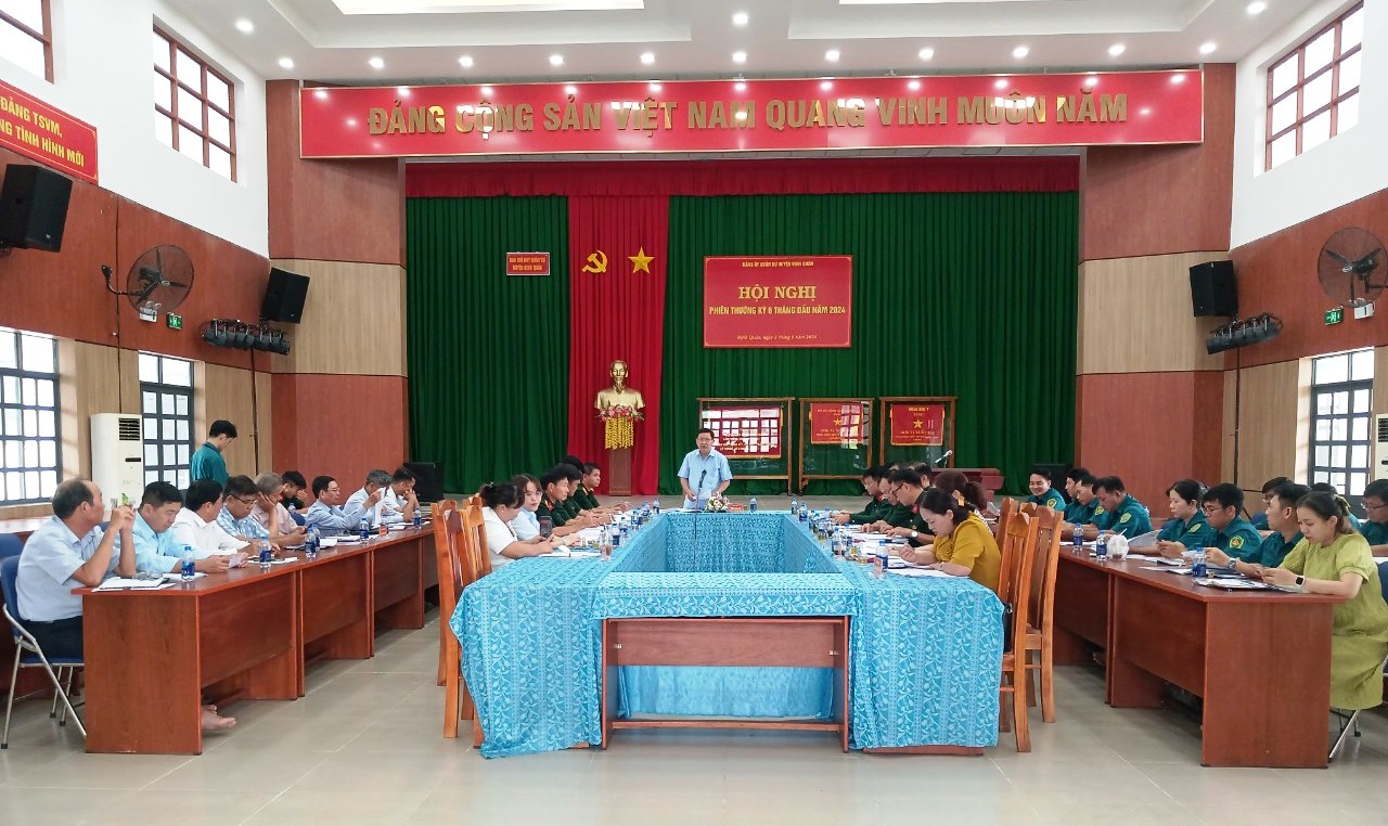 Sáng ngày 5/6, Đảng ủy Quân sự huyện Định Quán tổ chức hội nghị phiên thường kỳ 6 tháng đầu năm 2024 nhằm đánh giá kết quả lãnh đạo thực hiện nhiệm vụ quân sự, quốc phòng và công tác xây dựng Đảng bộ 6 tháng đầu năm. Tham dự hội nghị có Đại tá Nguyễn Văn Dũng – Đảng ủy viên, Đảng ủy Quân sự tỉnh, Phó Chỉ huy trưởng Bộ Chỉ huy Quân sự tỉnh Đồng Nai; đồng chí Trần Bá Đạt – Tỉnh ủy viên, Bí thư huyện ủy Định Quán, Bí thư Đảng ủy Quân sự huyện chủ trì hội nghị.