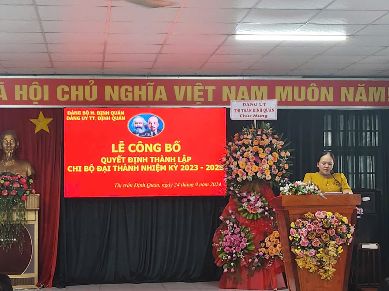 Chi bộ Công ty TNHH Đại Thành được thành lập là quyết tâm cao của BCH Đảng bộ thị trấn Định Quán và Đảng bộ huyện Định Quán trong phát triển tổ chức Đảng ở doanh nghiệp tư nhân. Công ty TNHH tư vấn, thiết kế, đo đạc Đại Thành ( khu phố Hiệp Tâm 1, thị trấn Định Quán) được thành lập năm 2018, ngành nghề hoạt động chính là đo đạc địa chính, xây dựng cầu đường, kinh doanh bất động sản, công chứng... Công ty hiện có 80 lao động. Trước khi thành lập chi bộ, công ty đã thành lập chi đoàn và công đoàn cơ sở công ty.