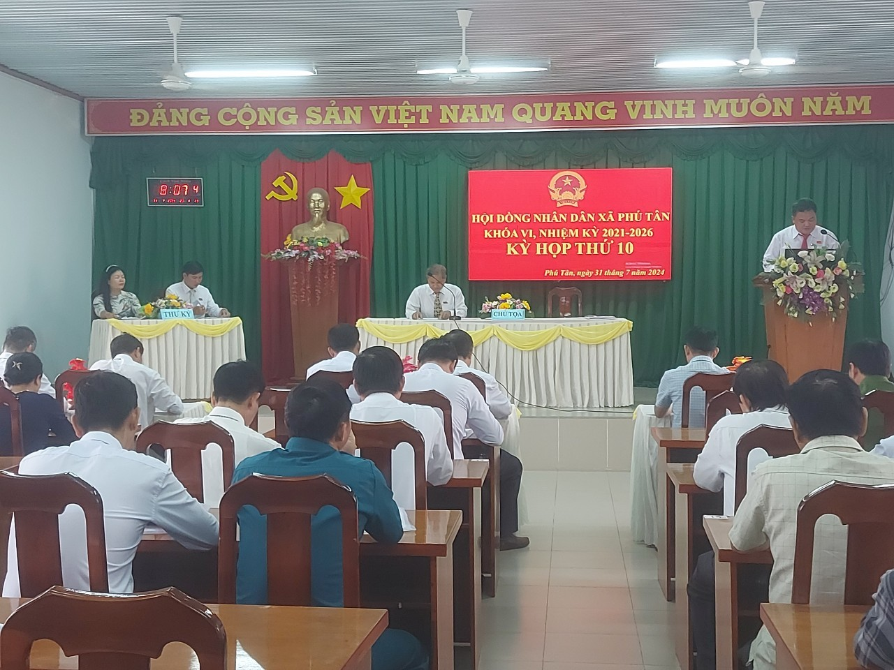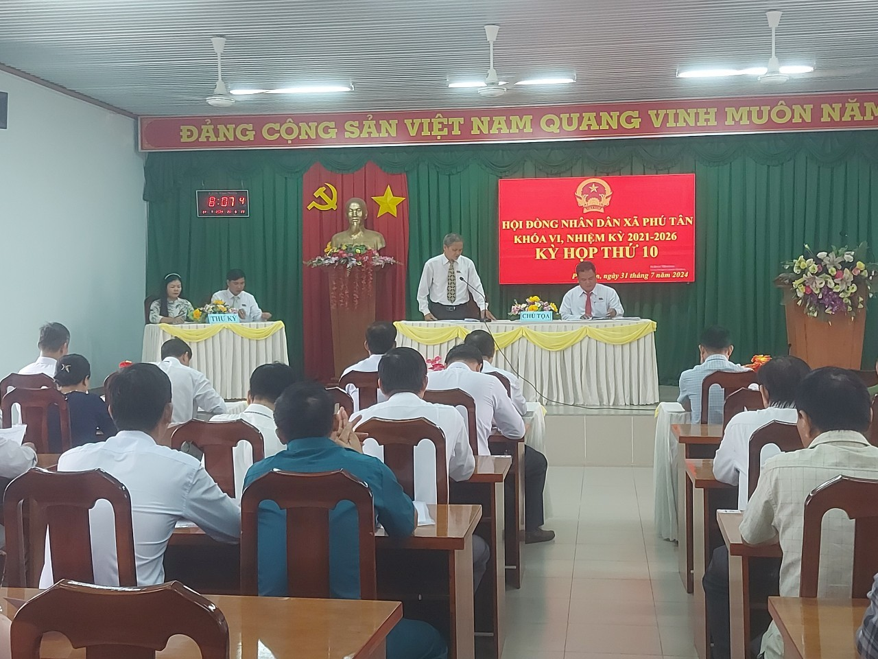 Ngày 31/7/2024, HĐND xã Phú Tân tổ chức kỳ họp thứ 10, khóa VI, nhiệm kỳ 2021-2026. Dự kỳ họp có đồng chí Lương Dủy Khải, Đại biểu HĐND huyện ứng cử trên địa bàn, đồng chí Nguyễn Khánh Đạt, Thường vụ Đảng ủy, Phó Bí thư Đảng ủy xã, đồng chí Trần Ngọc Huệ, Phó chủ tịch UBND xã và các đại biểu HĐND xã.