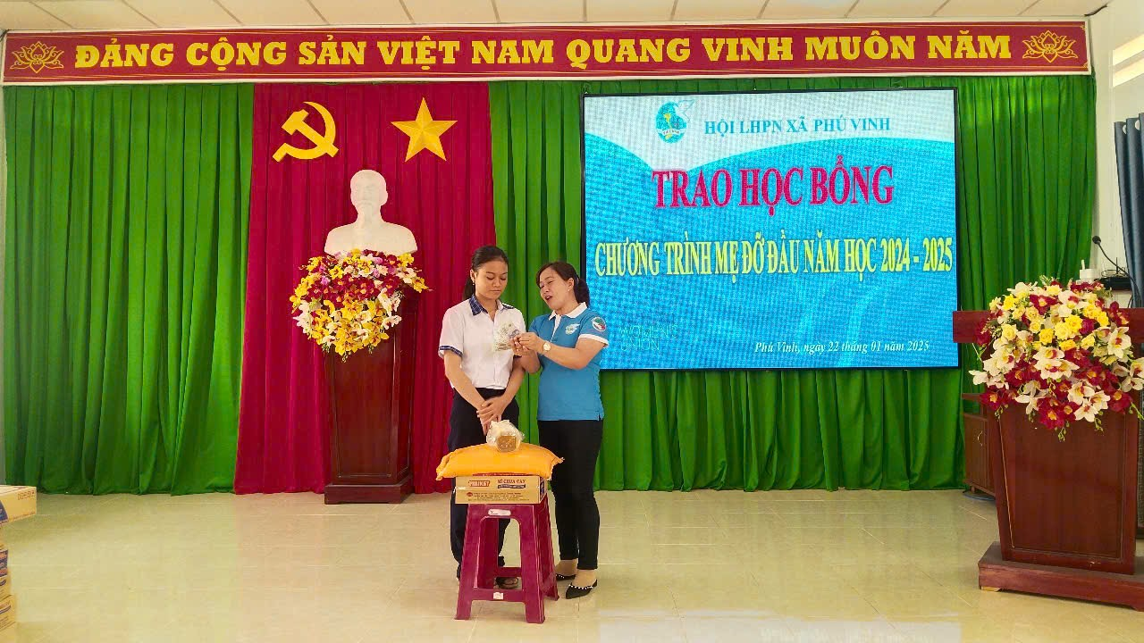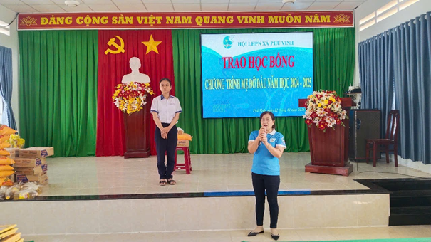 Thông qua việc kêu gọi vận động mạnh thường quân, học bổng đỡ đầu cho học sinh mồ côi cha, mẹ nhằm tạo điều kiện để tiếp sức cho em tiếp tục đến trường, đảm bảo tương lai ổn định cho em sau này. hội LHPN xã Phú Vinh vận động các mạnh thường quân trao tặng 3 triệu đồng và 1 phần quà trị giá 300.000 đồng, cho em Nguyễn Thị Hồng Nhung lớp 10 trường TT. Giáo dục thường xuyên huyện Định quán.