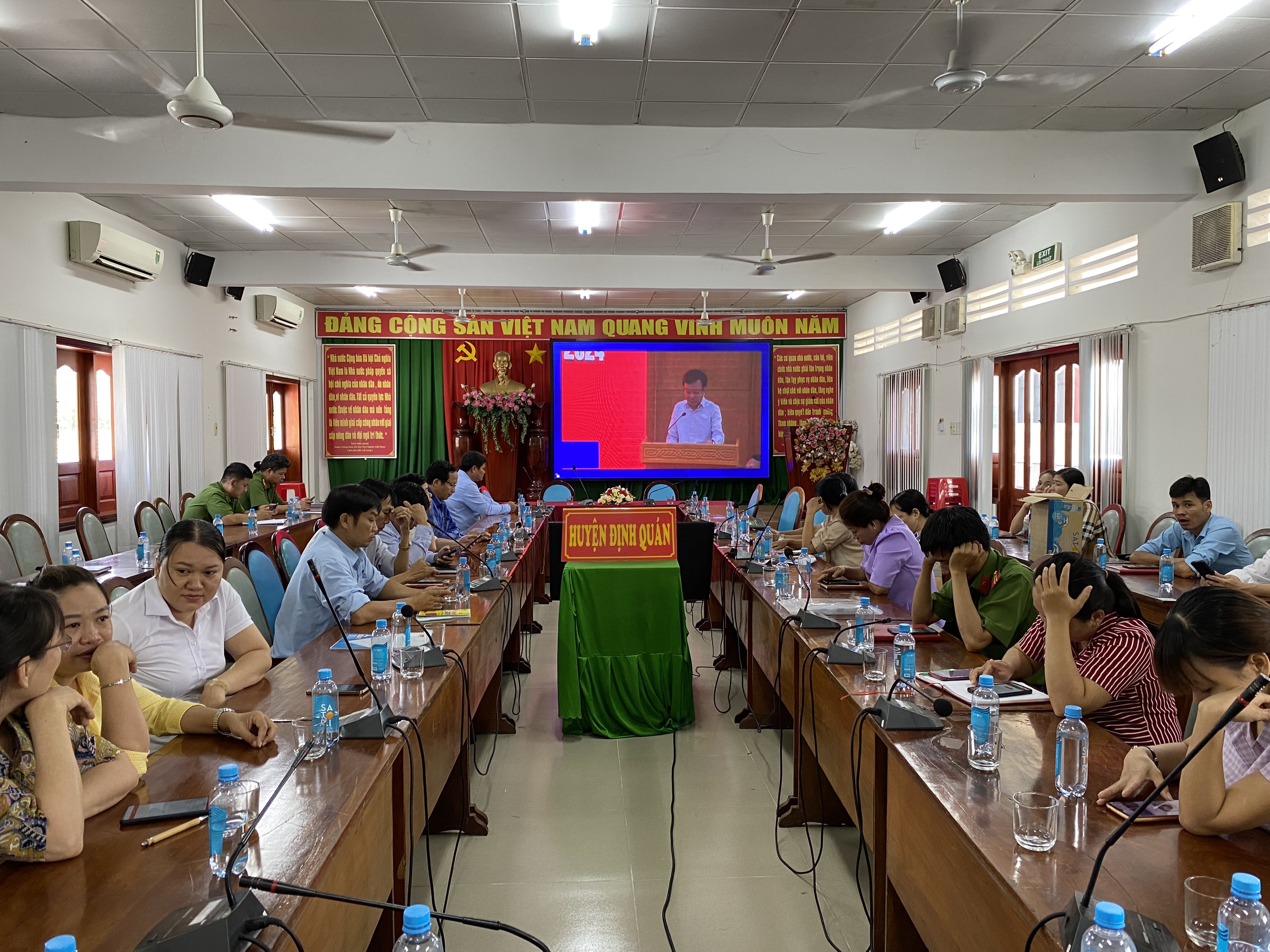 Sáng ngày 16/5/2023, Ban Thường vụ Huyện ủy Định Quán tổ chức Hội nghị báo cáo viên tháng 5/2024 bằng hình thức trực tuyến kết nối từ điểm cầu Trung ương đến điểm cầu cấp huyện cho 101 đồng chí là lãnh đạo ban Đảng, Văn phòng Huyện ủy, Trung tâm chính trị huyện, lãnh đạo UBND huyện, lãnh đạo MTTQ và các đoàn thể CT-XH huyện, Các đồng chí Trưởng, phó Công an huyện, Ban Chỉ huy các đội nghiệp vụ Công an huyện, Đồng chí Bí thư (hoặc PBT) các TCCSĐ trực thuộc huyện,, Các đồng chí trưởng, phó Công an các xã, thị trấn, Các đồng chí Trưởng, Phó Ban Tuyên giáo Đảng ủy các xã, thị trấn.