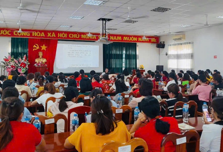 Thực hiện nhiệm vụ năm học 2024 - 2025, nhằm nâng cao chất chăm sóc giáo dục trẻ tại các cơ sở giáo dục mầm non. Ngày 15/08/2024 Phòng Giáo huấn dục và Đào tạo đã tổ chức tập huấn, bồi dưỡng chuyên môn trong thực hiện nhiệm vụ nuôi dưỡng, chăm sóc trẻ cho đội ngũ cán bộ quản lý (CBQL) phụ trách công tác bán trú và nhân viên cấp dưỡng các trường Mầm non trên địa bàn huyện.