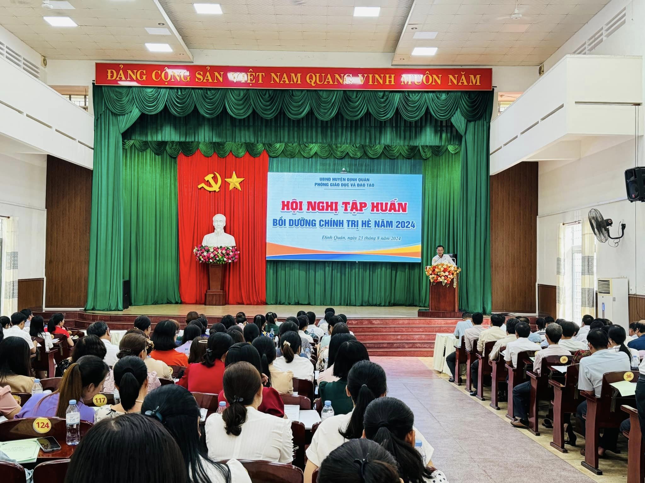 Sáng 23/08/2024, Ban Tuyên giáo Huyện ủy phối hợp với Phòng Giáo dục và Đào tạo huyện Định Quán tổ chức Hội nghị tập huấn bồi dưỡng chính trị hè năm 2024 cho đội ngũ cán bộ quản lý phòng Giáo dục và Đào tạo và các trường học trên địa bàn huyện. Dự lễ khai mạc lớp có các đồng chí lãnh đạo Ban Tuyên giáo Huyện ủy, lãnh đạo Phòng Giáo dục đào tạo huyện, các đồng chí báo cáo viên và các đồng chí cán bộ quản lý phòng Giáo dục và Đào tạo và các trường học trên địa bàn huyện.