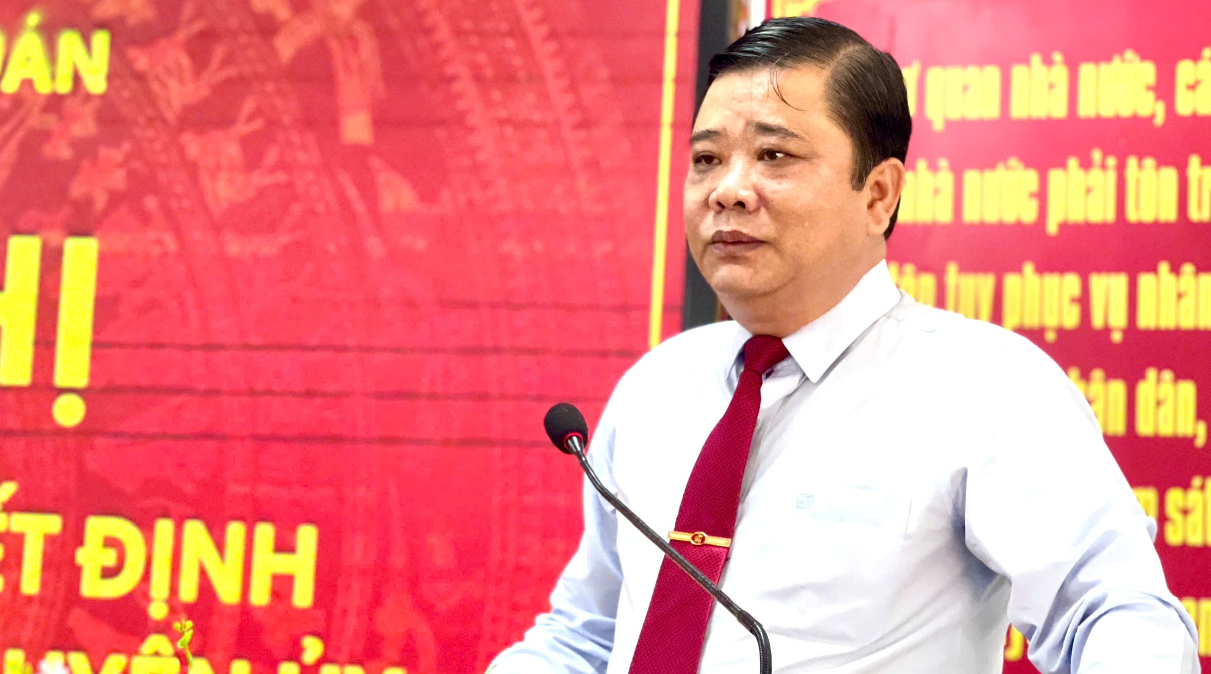 Phó bí thư thường trực huyện ủy Trần Hữu Hạnh phát biểu tại hội nghị triển khai các quyết định về công tác cán bộ