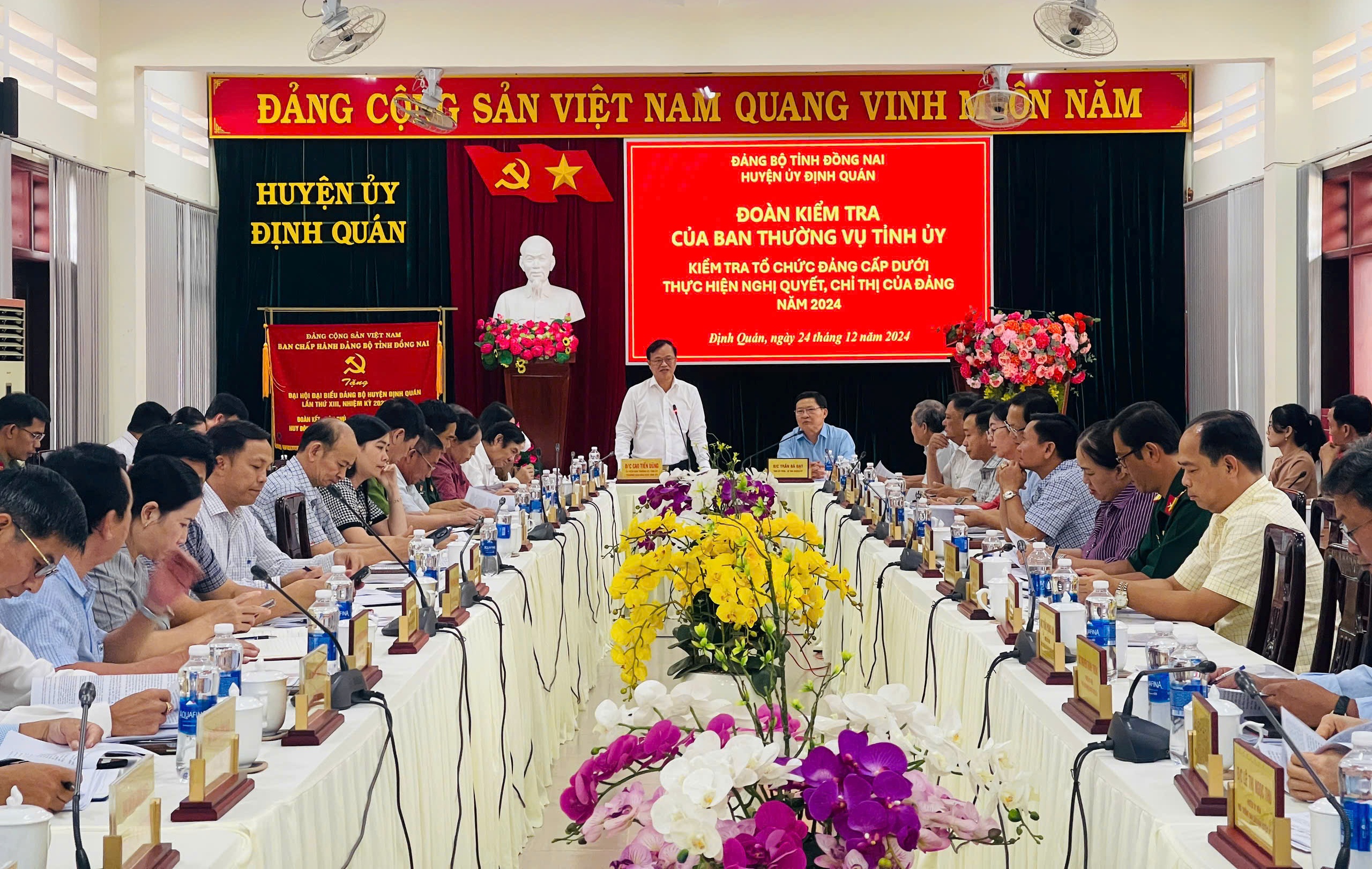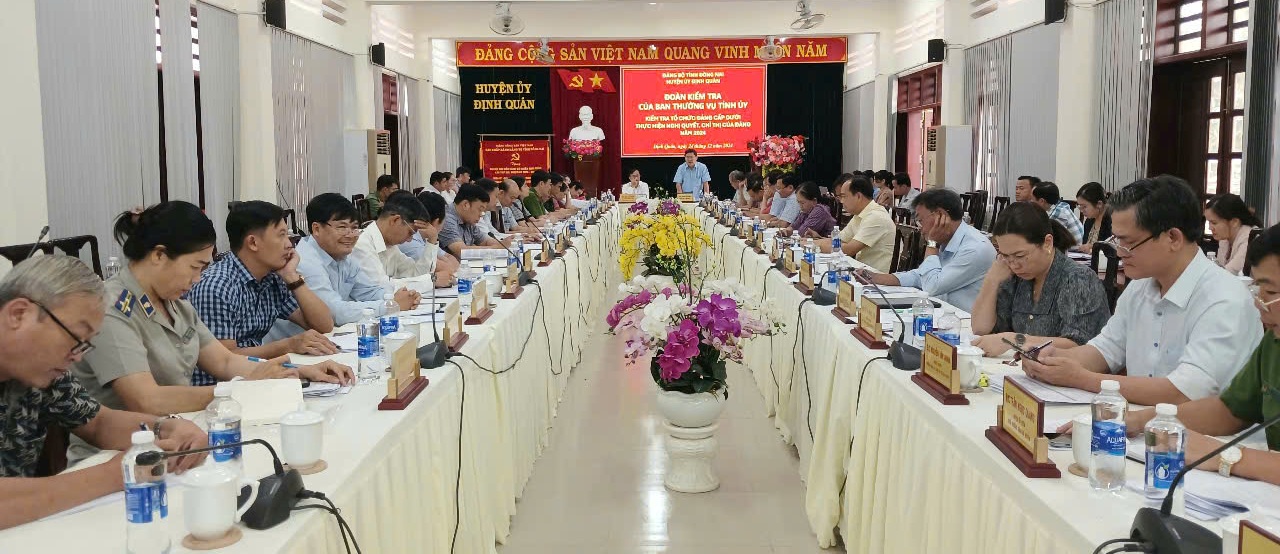 Chiều 24/12/2024, Đoàn kiểm tra Ban Thường vụ Tỉnh ủy do Ủy viên Ban Thường vụ Tỉnh ủy, Trưởng Ban Dân vận Tỉnh ủy Cao Tiến Dũng làm trưởng đoàn đã có buổi kiểm tra thực hiện Nghị quyết, Chỉ thị của Đảng năm 2024 tại Đảng bộ huyện Định Quán. Cùng dự buổi kiểm tra có Phó chủ tịch HĐND tỉnh Hoàng Thị Bích Hằng, Phó chủ tịch UBND tỉnh Nguyễn Sơn Hùng.