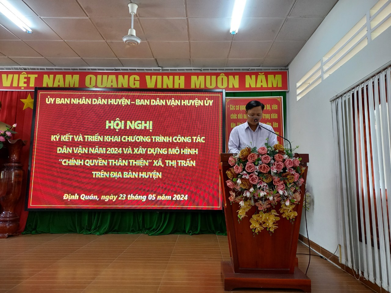 Sáng 23-5, Ban Dân vận Huyện ủy và Ủy ban nhân dân huyện đã tổ chức ký kết kế hoạch thực hiện công tác dân vận chính quyền năm 2024 và xây dựng, thực hiện mô hình Chính quyền thân thiện xã, thị trấn trên địa bàn huyện Định Quán. Các đồng chí: Trần Nam Biên - Phó Bí thư Huyện ủy, Chủ tịch Ủy ban nhân dân huyện; Đỗ Thành Trung - Huyện ủy viên, Trưởng Ban Dân vận Huyện ủy chủ trì hội nghị.