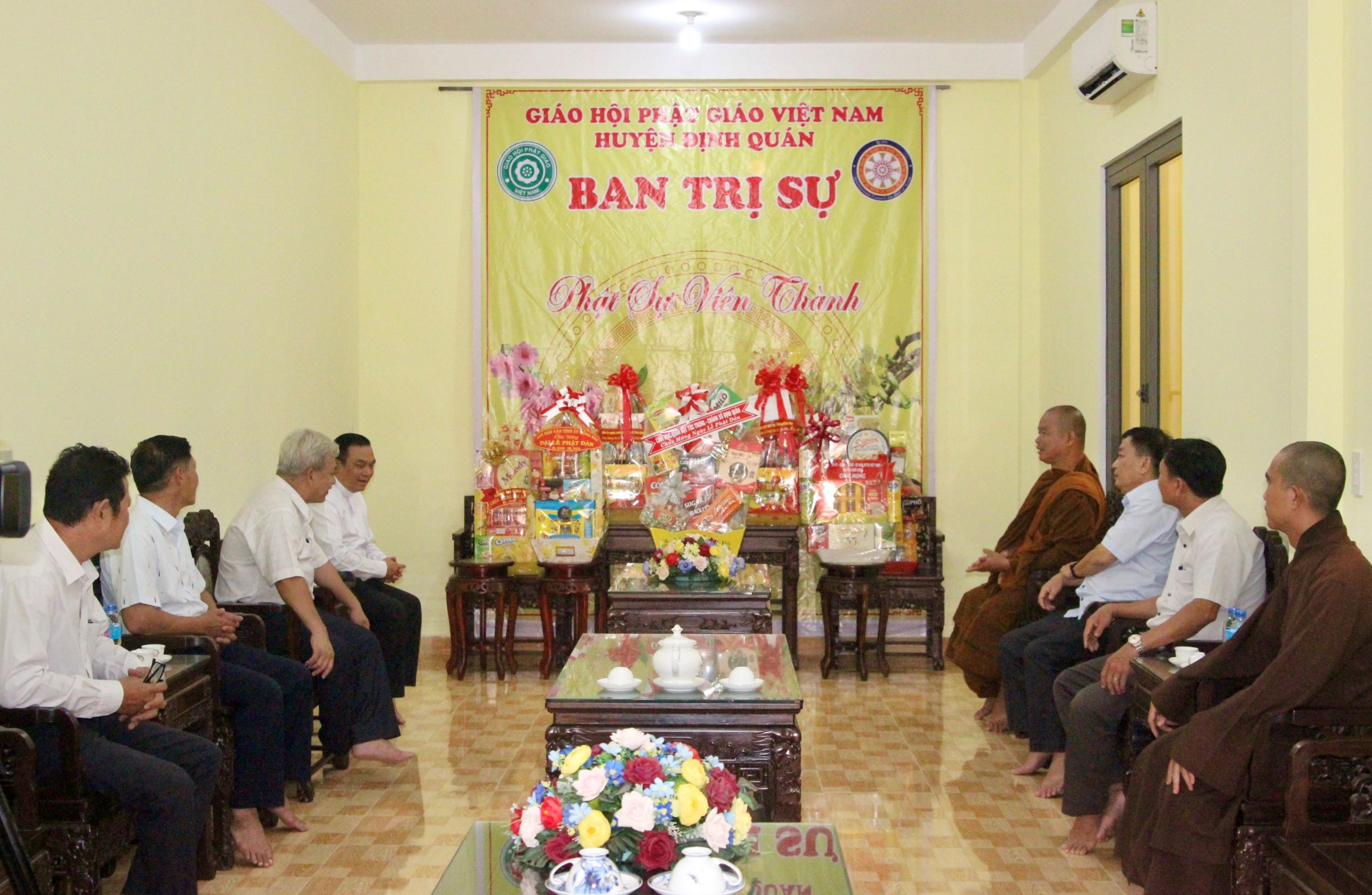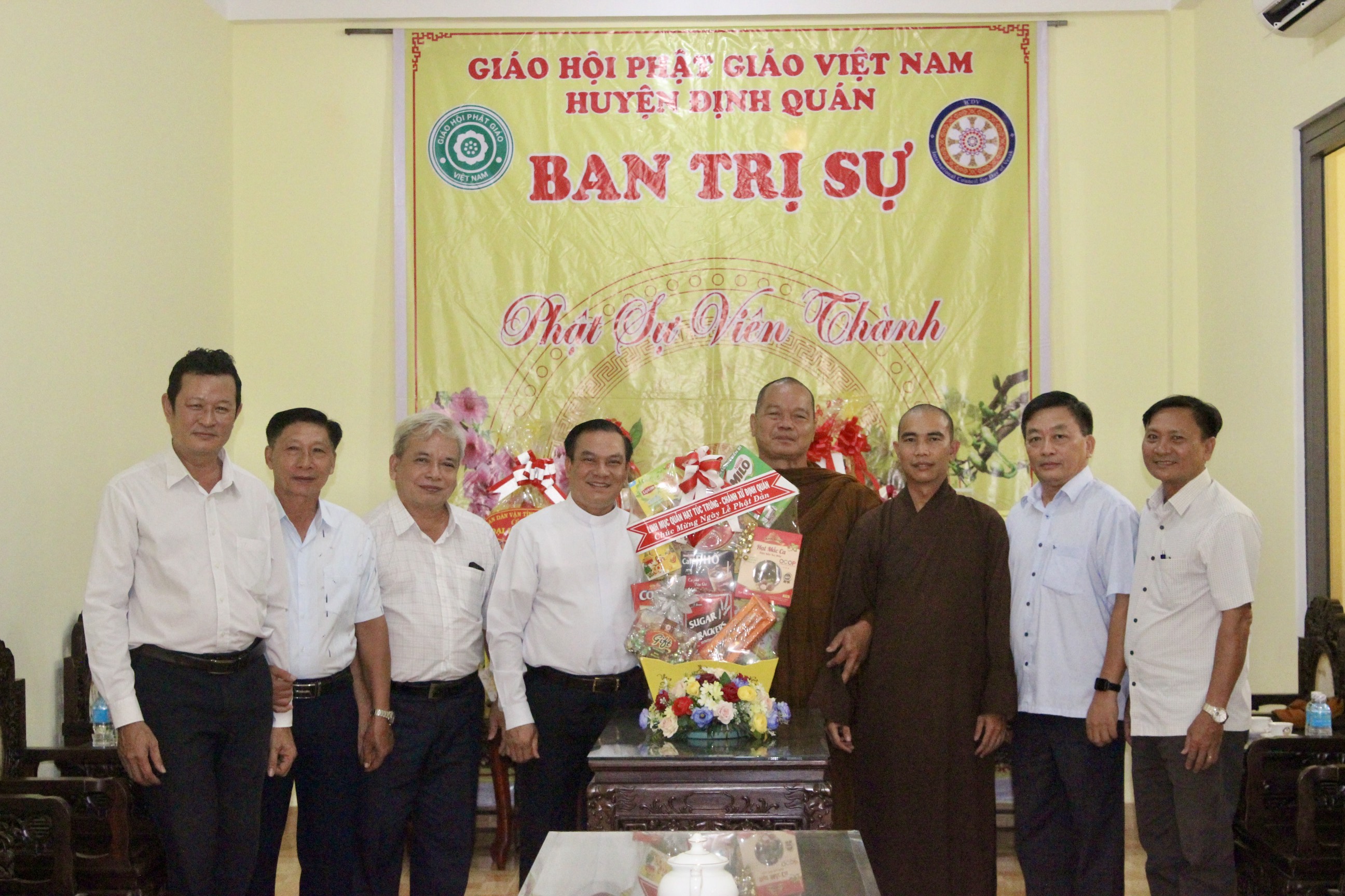 Trong không khí đón mừng ngày Đức Phật Đản sinh, thay mặt đoàn, Linh mục Vũ Văn Khải - Quản hạt Túc Trưng, Chánh xứ Giáo xứ Định Quán đã thăm hỏi, thể hiện sự vui mừng và chúc sức khỏe đến các vị trong Ban trị sự, Thượng tọa, Ni trưởng, Ni sư, đại đức tăng, ni và đồng bào phật tử một mùa lễ Phật Đản an vui, đầm ấm. Đồng thời nhấn mạnh về sự từ bi, bác ái của 2 tôn giáo, khẳng định sẽ luôn nêu cao tinh thần đoàn kết, hỗ trợ lẫn nhau để xây dựng khối đại đoàn kết dân tộc. Đáp lại lời chúc tốt đẹp của đoàn, trân trọng cảm ơn tình cảm và sự quan tâm của Linh mục Quản hạt Túc Trưng – Chánh xứ giáo xứ Định Quán, Thượng tọa Thích Pháp Đăng - Phó Ban thường trực Ban Trị sự Giáo hội Phật giáo Việt Nam huyện tin rằng: những dịp gặp gỡ thông qua các sự kiện đặc biệt như Phật đản, Giáng sinh…sẽ tiếp tục phát huy tinh thần đoàn kết, hòa hợp giữa 2 tôn giáo nhằm đem lại sự bình an, ổn định, góp phần thực hiện tốt công tác an sinh xã hội, đảm bảo an ninh chính trị, trật tự an toàn xã hội, thúc đẩy sự phát triển của huyện nhà.