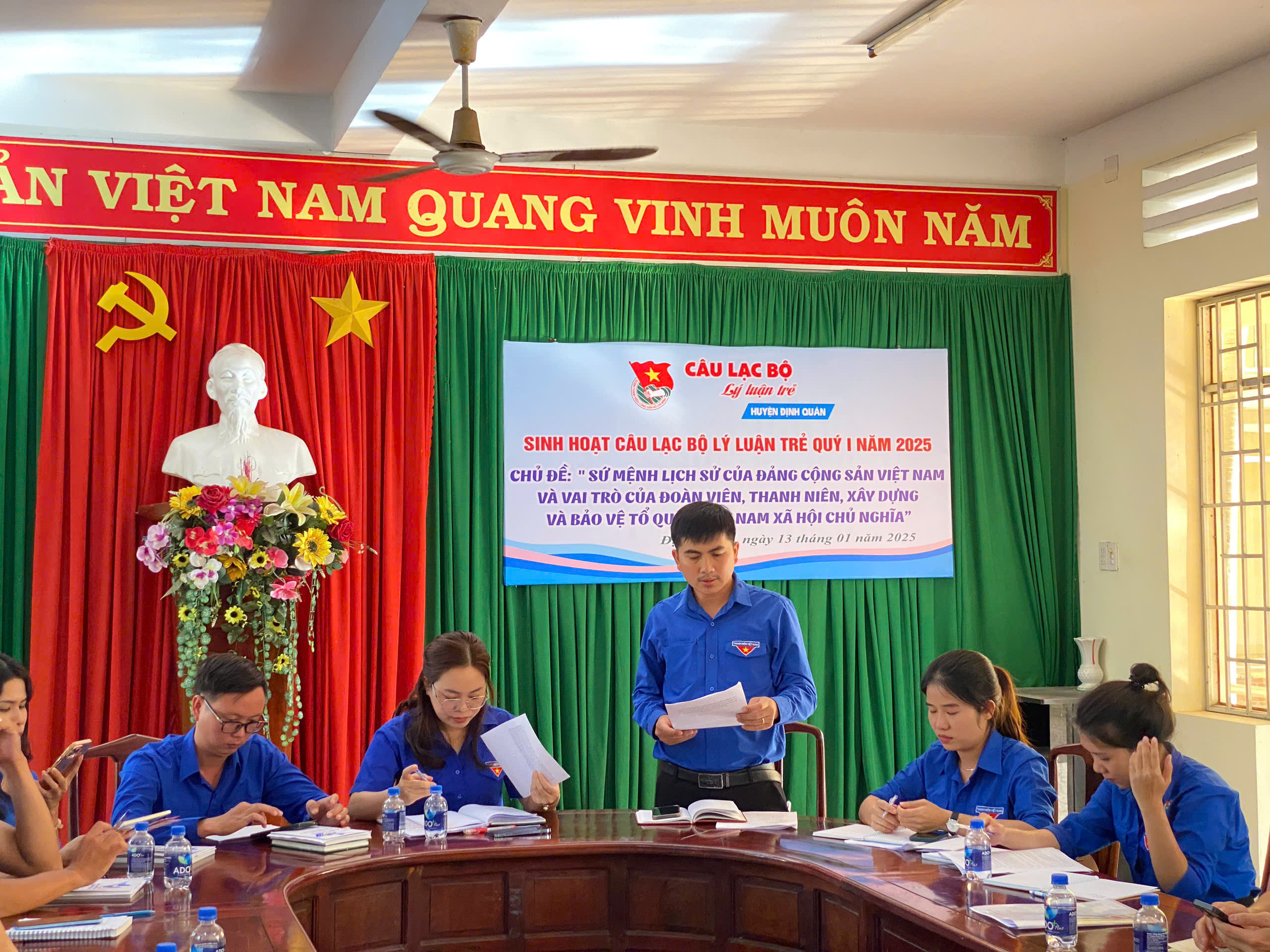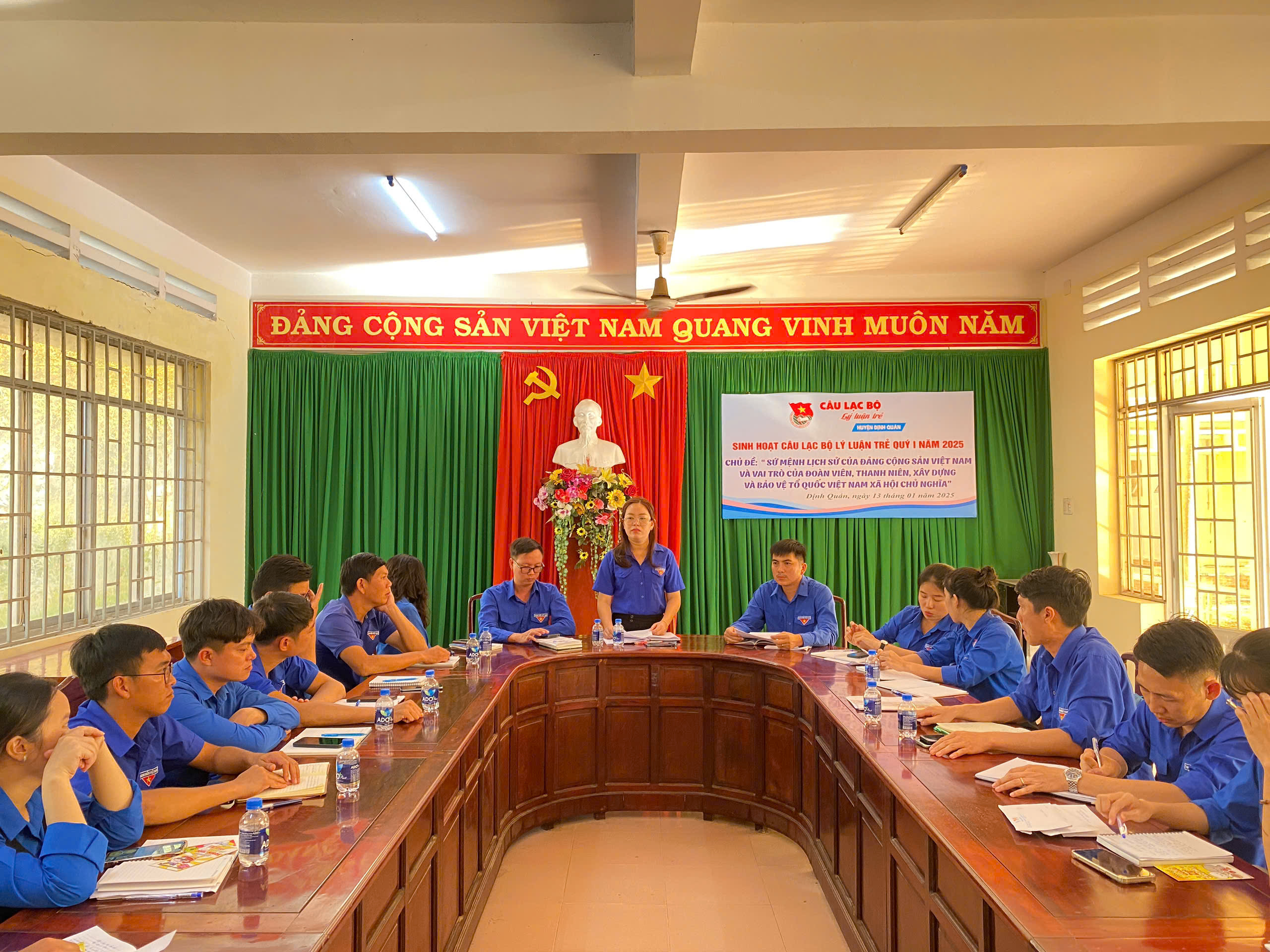 Thiết thực chào mừng kỷ niệm 95 năm thành lập Đảng Cộng sản Việt Nam (03/02/1930 – 03/02/2025) và 94 năm ngày thành lập Đoàn TNCS Hồ Chí Minh (26/3/1931 – 26/3/2025), ngày13/01/2025, Huyện Đoàn Định Quán đã tổ chức buổi sinh hoạt Câu lạc bộ Lý luận trẻ quý I năm 2025 với chủ đề: “Sứ mệnh lịch sử của Đảng Cộng sản Việt Nam và vai trò của đoàn viên, thanh niên trong xây dựng và bảo vệ Tổ quốc Việt Nam xã hội chủ nghĩa”.