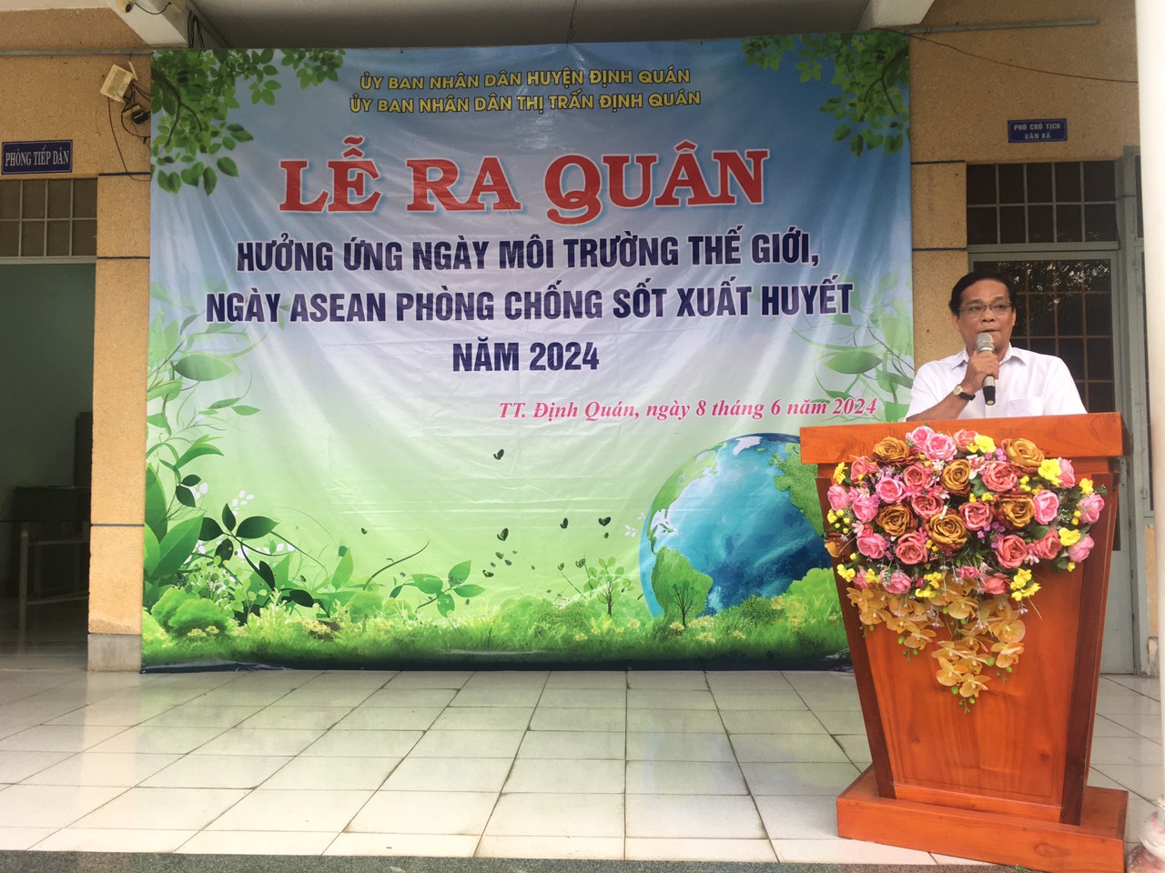 Đ/c Nguyễn Trai – PCT.UBND thị trấn Định Quán phát động tổng vệ sinh môi trường phòng ngày thứ bảy hàng tuần phòng, chống dịch sốt xuất huyết.