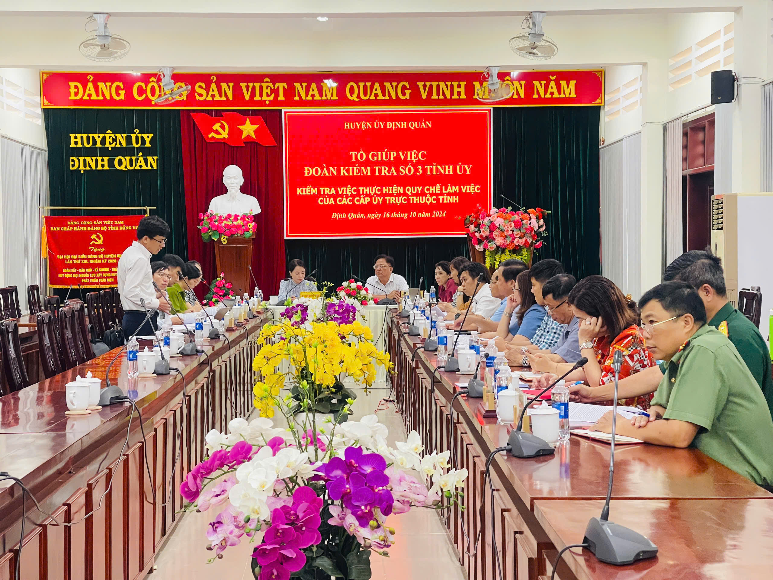 Ngày 16/10/2024, Tổ giúp việc Đoàn kiểm tra số 3 Tỉnh ủy đã có buổi làm việc với Huyện ủy Định Quán về kiểm tra việc thực hiện quy chế làm việc của các cấp ủy trực thuộc tỉnh.