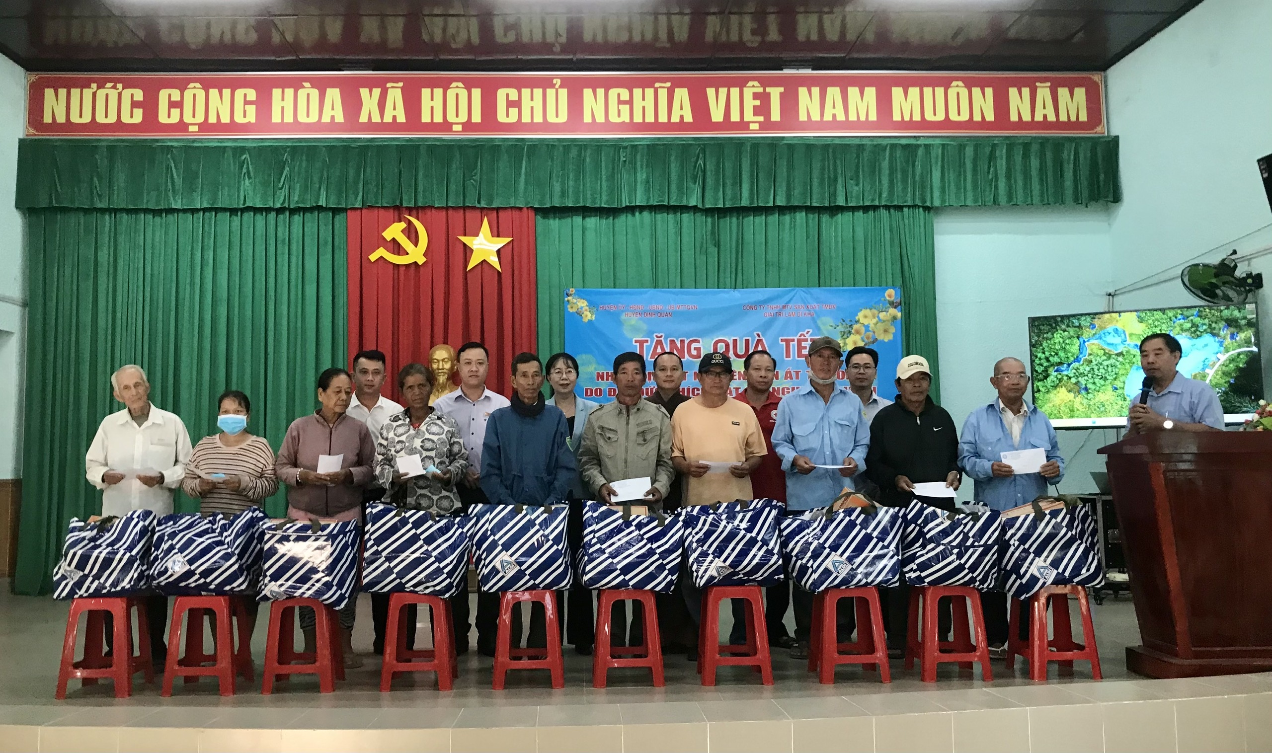 Từ nguồn vận động Đại đức Thích Đạt Ma Nghiêm Thuận - Thiền Viện Trúc Lâm Long Đức và công ty TNHH MTV SX TMDV giải trí Lâm Dĩ Kha, đã trao 300 phần quà đến tận tay bà con nơi đây. Mỗi phần quà trị giá 500 ngàn đồng, gồm: gạo, mì, nhu yếu phẩm và 100 ngàn đồng tiền mặt, với tổng trị giá 150 triệu đồng. Tuy phần quà có giá trị không lớn, nhưng đó là tấm lòng, tình cảm của nhà tài trợ mong muốn chia sẻ một phần khó khăn với bà con. Qua đó, động viên bà con phấn đấu vươn lên trong lao động sản xuất, ổn định cuộc sống và đón Tết cổ truyền của dân tộc đầm ấm, vui tươi.