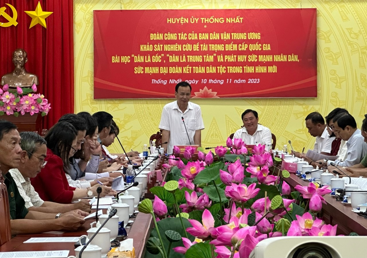 Sáng ngày 10/11/2023, Đoàn khảo sát Ban Dân vận Trung ương về khảo sát đề tài trọng điểm cấp Quốc gia bài học “Dân là gốc”, “Dân là trung tâm” và vấn đề phát huy sức mạnh Nhân dân, sức mạnh đại đoàn kết toàn dân tộc trong tình hình mới" do đồng chí Nguyễn Lam - Phó Trưởng Ban Dân vận Trung ương làm Trưởng đoàn đã đã có buổi làm việc tại huyện Thống Nhất. Cùng đi với Đoàn có đồng chí Đào Đoan Hùng - Vụ trưởng Vụ nghiên cứu Ban Dân vận Trung ương; đồng chí Vũ Anh Tuấn - Vụ trưởng - Trưởng cơ quan Thường trực Ban Dân vận Trung ương tại Thành phố Hồ Chí Minh; đồng chí Nguyễn Thị Tố Nga - Phó Vụ trưởng Vụ Nghiên cứu, Ban Dân vận Trung ương và các thành viên Đoàn công tác; đồng chí Nguyễn Thị Vẹn - Phó Trưởng Ban Dân vận Tỉnh ủy.
