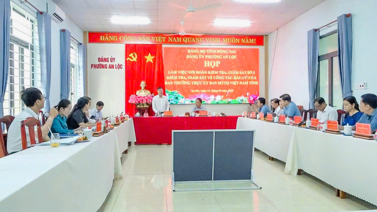 Chiều ngày 14-1, Đoàn kiểm tra, giám sát số 3 của Ban Thường trực Ủy ban Mặt trận Tổ quốc Việt Nam tỉnh đã có buổi làm việc với Ủy ban bầu cử phường An Lộc nhằm kiểm tra, đánh giá tình hình triển khai công tác chuẩn bị bầu cử trên địa bàn phường theo quy định của pháp luật. Đoàn kiểm tra, giám sát số 3 do đồng chí Nguyễn Tấn Phú, Phó Chủ tịch Ủy ban MTTQ Việt Nam tỉnh làm Trưởng đoàn; cùng tham dự có các thành viên là đại diện các ban chuyên môn của Ủy ban MTTQ tỉnh. Tiếp và làm việc với đoàn có đồng chí Đỗ Minh Trung, Bí thư Đảng ủy, Chủ tịch Hội đồng nhân dân, Chủ tịch Ủy ban bầu cử phường An Lộc, cùng các thành viên Ủy ban bầu cử phường.