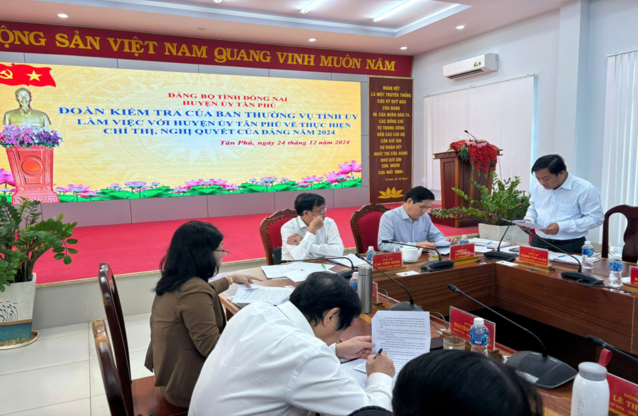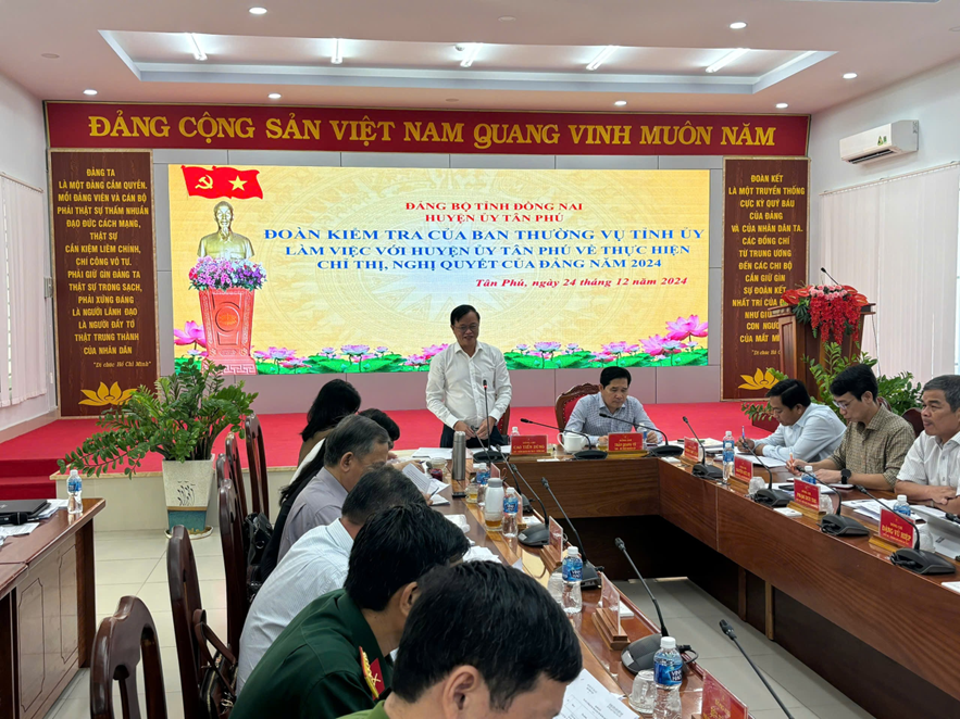 Thực hiện Kế hoạch số 409-KH/TU và Quyết định số 1975-QĐ/TU, ngày 6/12/2024 của Ban Thường vụ Tỉnh ủy về kiểm tra thực hiện Nghị quyết, Chỉ thị của Đảng năm 2024; sáng ngày 24/12/2024, Đoàn Kiểm tra làm việc với Đảng bộ huyện Tân Phú về kết quả lãnh đạo, triển khai thực hiện Nghị quyết số 11-NQ/TU, ngày 7/12/2023 của Ban Chấp hành Đảng bộ tỉnh (khóa XI) về các chỉ tiêu, nhiệm vụ và giải pháp chủ yếu phát triển kinh tế - xã hội, quốc phòng, an ninh, xây dựng Đảng, đoàn thể năm 2024. Đồng chí Cao Tiến Dũng, UVTV - Trưởng ban Ban Dân vận Tỉnh ủy - Trưởng đoàn kiểm tra chủ trì buổi làm việc; thành viên đoàn kiểm tra có lãnh đạo các ban, ngành, đoàn thể tỉnh (theo Quyết định số 1975-QĐ/TU, ngày 6/12/2024 của Ban Thường vụ Tỉnh ủy). Tiếp đoàn kiểm tra có các đồng chí trong Thường trực, Ban Thường vụ Huyện ủy, Ban Chấp hành Đảng bộ huyện, Trưởng các phòng, ban, ngành, đoàn thể huyện Tân Phú.