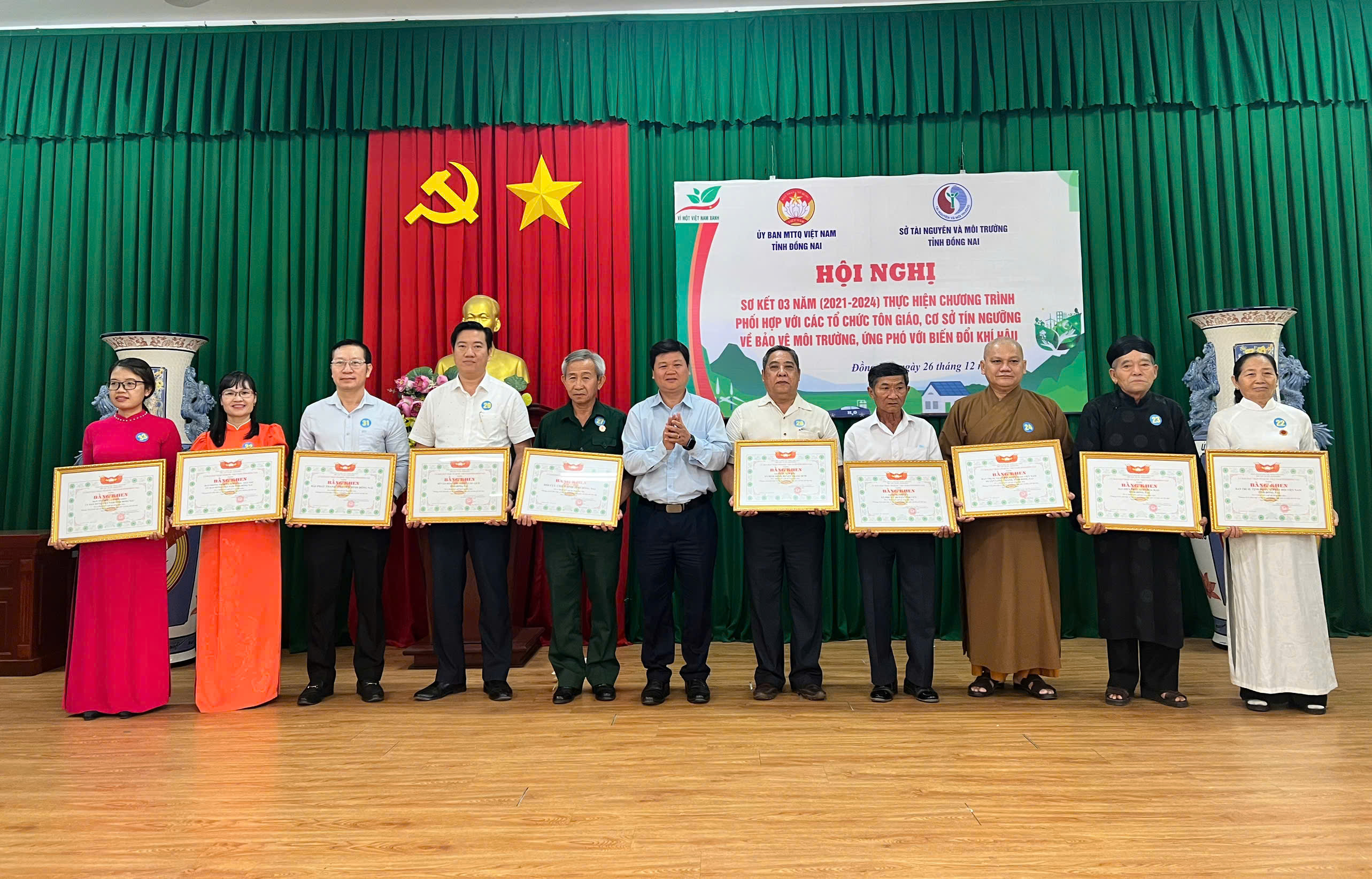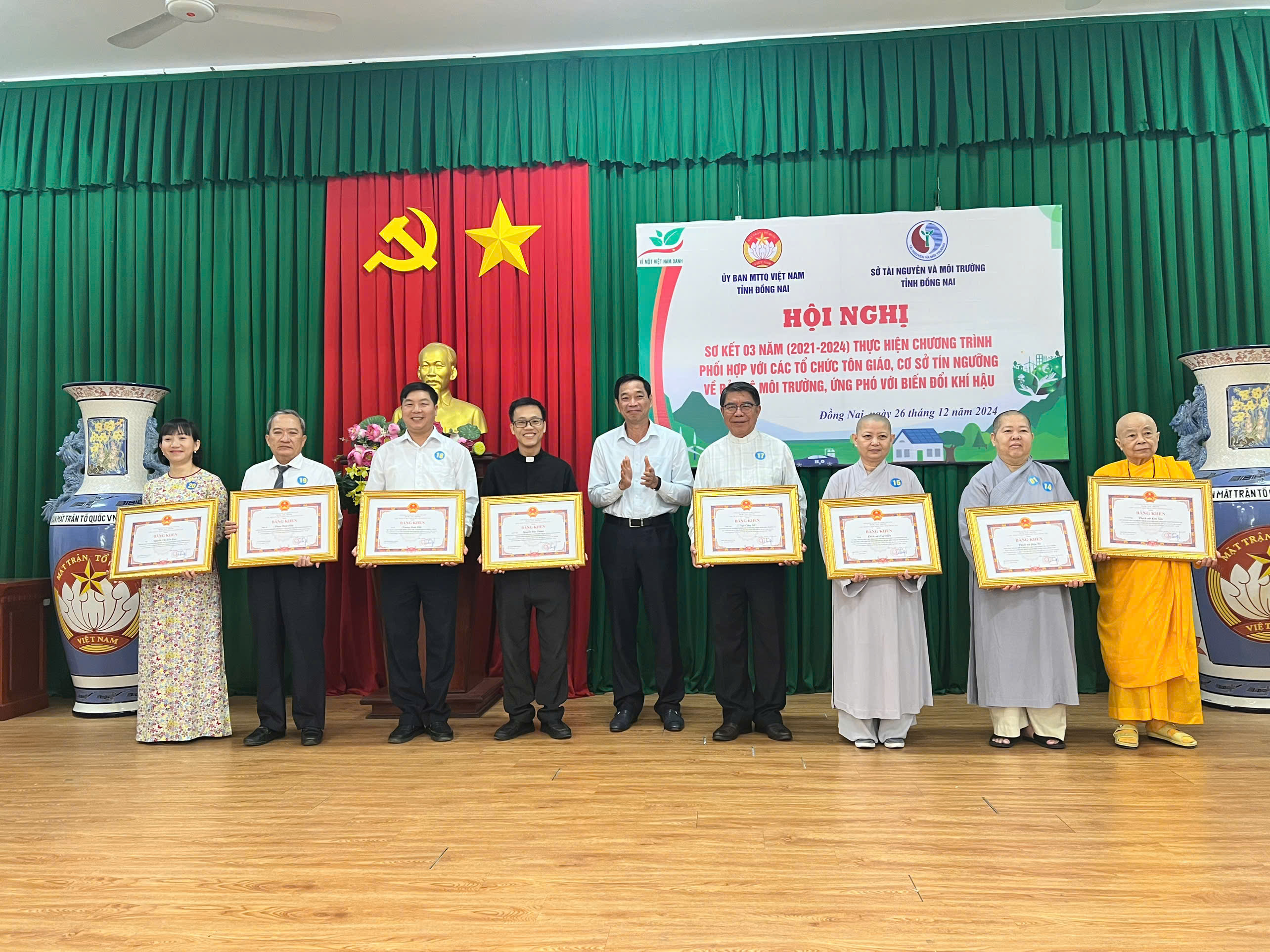 Sáng ngày 26/12/2024, Ban Thường trực Ủy ban MTTQ Việt Nam tỉnh phối hợp với Sở Tài nguyên và Môi trường tổ chức Hội nghị sơ kết 03 năm (2021-2024) thực hiện Chương trình phối hợp với các tổ chức tôn giáo, cơ sở tín ngưỡng về BVMT, ứng phó với biến đổi khí hậu" trên địa bàn tỉnh Đồng Nai, giai đoạn 2021-2026. Tham dự và chủ trì Hội nghị có các đồng chí: Võ Văn Phi, TUV, Phó Chủ tịch UBND tỉnh; Vũ Đình Trung, Phó Chủ tịch Ủy ban MTTQ Việt Nam tỉnh Đồng Nai; Trần Trọng Toàn, Phó Giám đốc Sở Tài nguyên và Môi trường; cùng đại diện lãnh đạo các sở, ban, ngành tỉnh; các tổ chức tôn giáo, cơ sở tín ngưỡng trên địa bàn tỉnh.