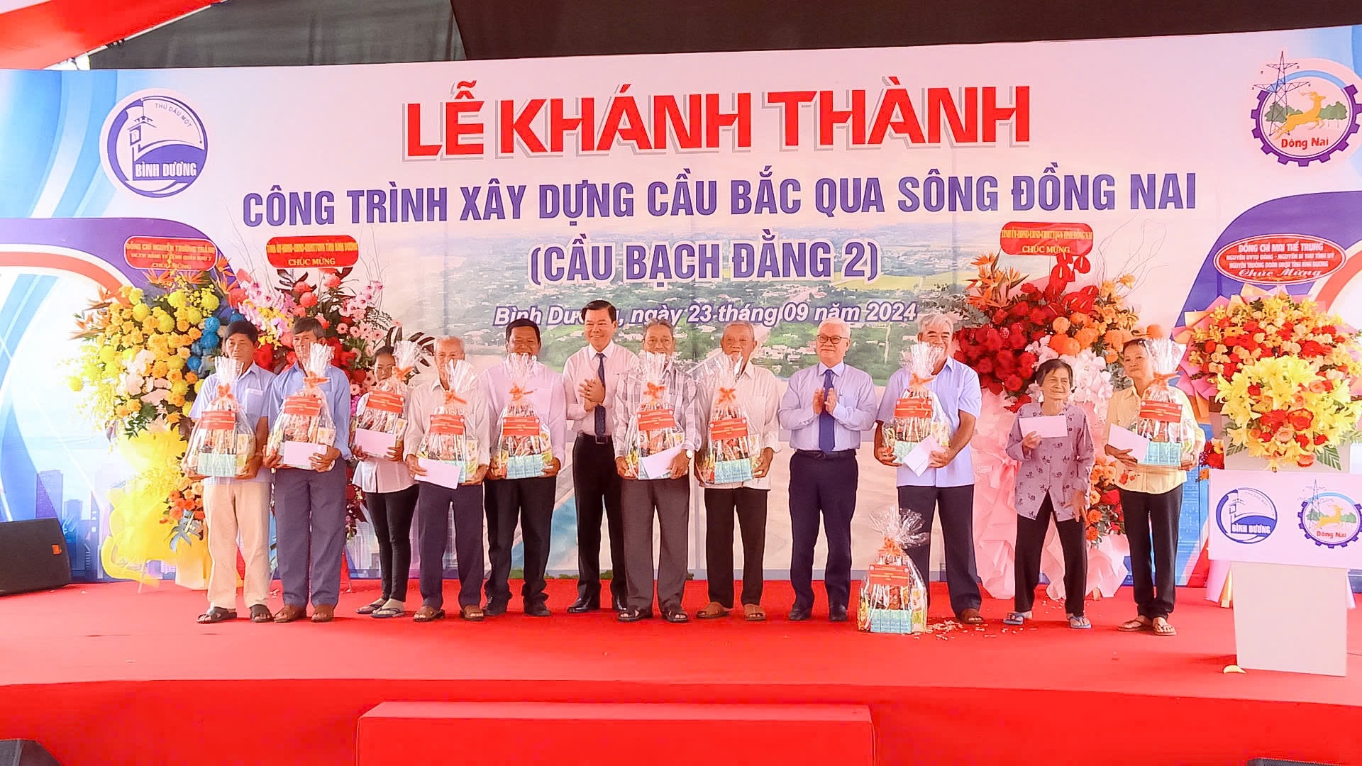 Tại lễ khánh thành, lãnh đạo 2 tỉnh Bình Dương và Đồng Nai đã tặng quà cảm ơn các hộ dân có sự đồng hành, hỗ trợ tích cực nhất cho Dự án cầu Bạch Đằng 2.