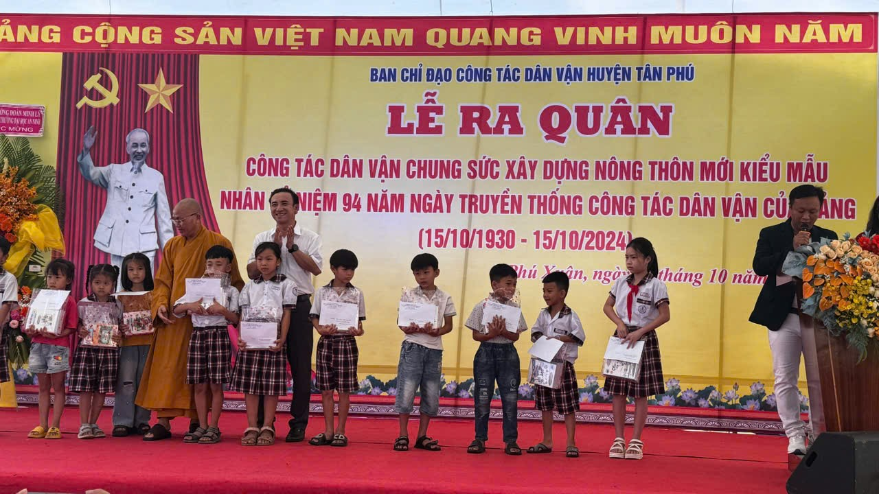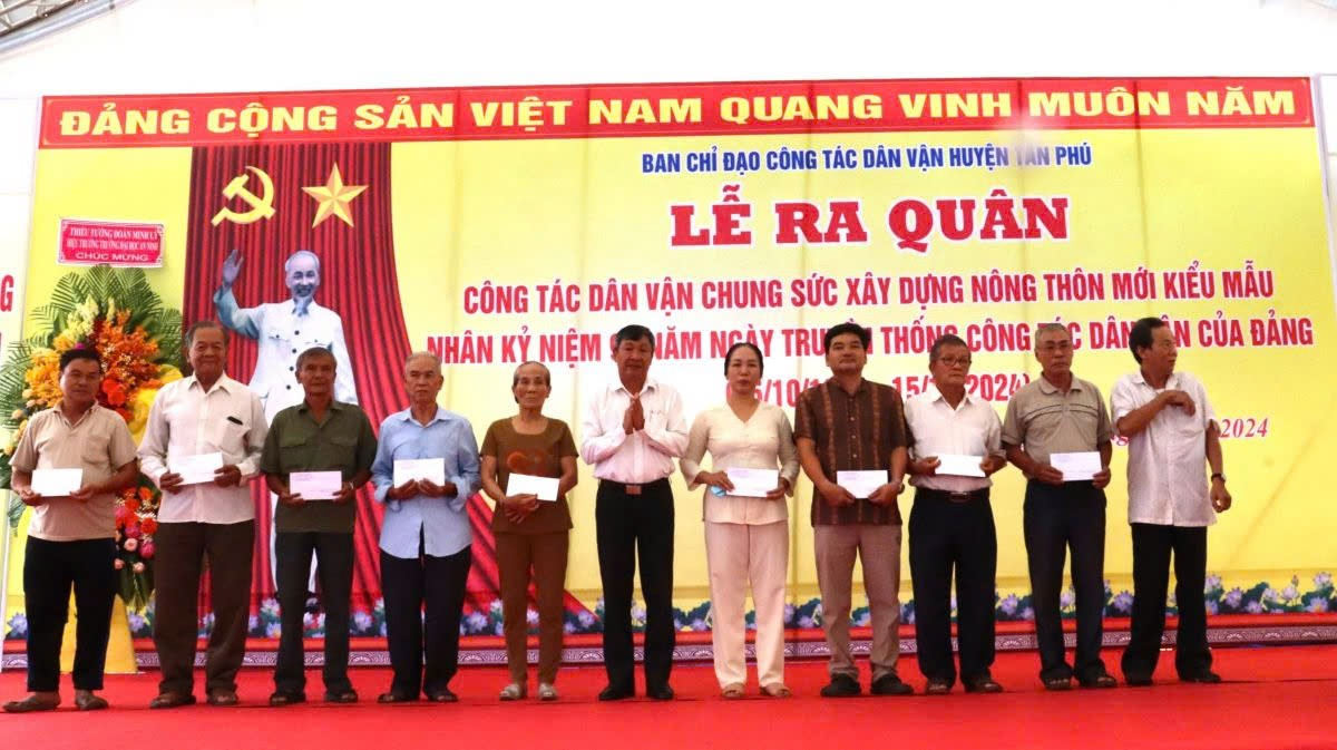 Phát biểu tại lễ ra quân, đồng chí Trần Quang Tú, TUV, Bí thư Huyện ủy Tân Phú, Trưởng ban Chỉ đạo công tác dân vận huyện bày tỏ cảm ơn đối với lãnh đạo Trung ương, tỉnh, các huyện, các tổ chức tôn giáo, mạnh thường quân đã hỗ trợ vật chất, tinh thần để thực hiện lễ ra quân, phát động dân vận chung sức xây dựng nông thôn mới kiểu mẫu. Trong thời gian qua hệ thống dân vận các cấp đã chủ động, phối hợp tốt với chính quyền, các cơ quan, ban, ngành, đoàn thể đã tuyên truyền, vận động nhân dân chấp hành, tham gia tích cực chương trình mục tiêu quốc gia xây dựng nông thôn mới, phát triển kinh tế - xã hội trên địa bàn huyện, đảm bảo quốc phòng-an ninh, an sinh xã hội, nâng cao đời sống vật chất, tinh thần cho nhân dân. Bí thư Huyện ủy Tân Phú đề nghị, để đợt ra quân làm dân vận đạt hiệu quả cao, các ban, ngành, thành viên Ban Chỉ đạo Công tác dân vận huyện phối hợp chặt chẽ, thực hiện hoàn thành các nội dung chương trình công tác dân vận. Các tổ chức chính trị-xã hội trên địa bàn huyện, hướng mạnh về cơ sở, nắm chắc tình hình đời sống nhân dân, đặc biệt là quan tâm ở những địa bàn vùng đồng bào dân tộc thiểu số, vùng đồng bào theo tôn giáo, vùng sâu, vùng xa, vùng đặc biệt khó khăn.