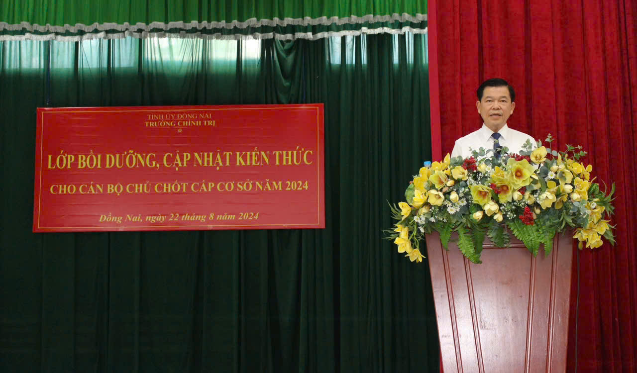Thực hiện Đề án số 05-ĐA/TU, ngày 29/12/2023 của Ban Thường vụ Tỉnh ủy về bồi dưỡng cập nhật kiến thức đối với cán bộ chủ chốt cấp cơ sở đủ phẩm chất, năng lực và uy tín ngang tầm nhiệm vụ giai đoạn 2023-2025 và những năm tiếp theo, ngày 06/8/2024, Trường Chính trị tỉnh ban hành Kế hoạch số 262-KH/TCT về chiêu sinh, mở lớp bồi dưỡng, cập nhật kiến thức cho cán bộ chủ chốt cấp cơ sở năm 2024 được chia làm 07 lớp học trực tiếp, khoảng từ 100-150 học viên dự kiến diễn ra từ cuối tháng 8/2024 đến hết tháng 01/2025. Đối tượng là cán bộ chủ chốt đương chức và quy hoạch ở cơ sở thuộc diện quản lý của Ban Thường vụ cấp ủy cấp huyện và tương đương quản lý (không bao gồm cán bộ chủ chốt cấp cơ sở trực thuộc Đảng ủy Công an tỉnh và Bộ Chỉ huy Quân sự tỉnh). Tổng 20 chuyên đề, gồm: Định hướng, tầm nhìn Đồng Nai phát triển bền vững; Quản trị nguồn nhân lực trong hội nhập quốc tế hiện nay; Hội nhập kinh tế quốc tế, cơ hội và thách thức đối với cấp cơ sở; Quản trị doanh nghiệp trong bối cảnh hiện nay và bài học kinh nghiệm cho Đồng Nai; Chuyển đổi số và cải cách hành chính tại cấp cơ sở; Tăng trưởng xanh và thực hiện mục tiêu phát thải ròng bằng 0 (Net Zero); Nâng cao năng lực cạnh tranh cấp tỉnh và nhiệm vụ của cấp cơ sở; Đảm bảo an ninh trật tự, an toàn xã hội tại cơ sở; Kỹ năng đề xuất, tham mưu xây dựng kế hoạch, đề án; Kỹ năng làm việc trong môi trường quốc tế; Kỹ năng xây dựng các sản phẩm thương hiệu, khai thác lợi thế so sánh của địa phương; Đổi mới phương thức lãnh đạo của Đảng trong tình hình mới ở cơ sở; Thực hiện nguyên tắc tập trung dân chủ trong Đảng; Cán bộ và công tác cán bộ ở cơ sở trong giai đoạn hiện nay; Xây dựng khối đại đoàn kết toàn dân tại địa bàn cơ sở; Kỹ năng xử lý tình huống tại địa bàn cơ sở; Kỹ năng xây dựng tổ chức đảng và phát triển đảng viên trong doanh nghiệp tư nhân, doanh nghiệp có vốn đầu tư nước ngoài; Kỹ năng bảo vệ nền tảng tư tưởng của Đảng, đấu tranh phản bác các quan điểm sai trái thù địch trong tình hình mới; Kỹ năng tuyên truyền, thuyết phục; Kỹ năng phản biện của Mặt trận Tổ quốc và các tổ chức Chính trị- xã hội cấp xã; Một số chuyên đề khác phù hợp do cấp ủy cấp huyện và tương đương lựa chọn quyết định.
