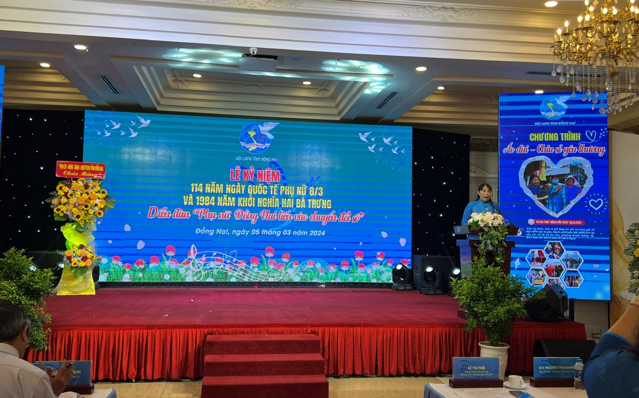 Ngày 05/03/2024, Ban Thường vụ Hội Liên hiệp Phụ nữ tỉnh tổ chức hoạt động hướng về kỷ niệm 114 năm ngày Quốc tế Phụ nữ 8/3 và 1984 năm Khởi nghĩa Hai Bà Trưng, đồng thời, tổ chức diễn đàn "phụ nữ Đồng Nai tiến vào chuyển đổi số" nhằm tiếp tục nâng cao kiến thức, kỹ năng cho cán bộ Hội các cấp trong thời kỳ chuyển đổi số quốc gia, góp phần thực hiện đạt các tiêu chí trong phong trào thi đua “Xây dựng người phụ nữ Việt Nam thời đại mới”.