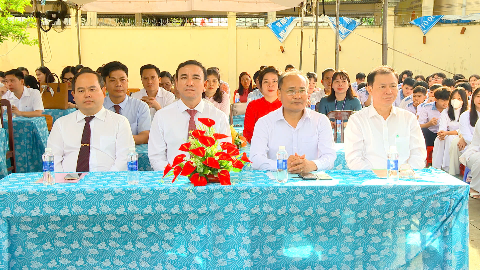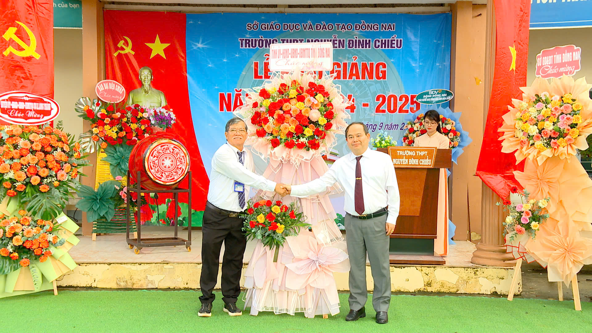 Dự Lễ khai giảng, đồng chí Phó Bí thư Tỉnh ủy đã trao lẵng hoa của Tỉnh ủy - HĐND - UBND - Ủy ban MTTQ Việt Nam tỉnh tặng chúc mừng tập thể giáo viên, học sinh Trường Trung Phổ thông Nguyễn Đình Chiểu.