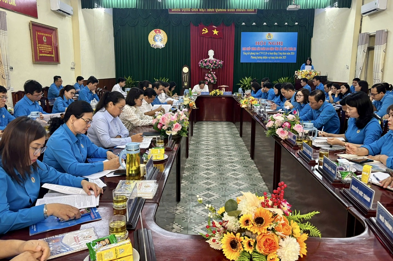Tại hội nghị, đồng chí Bùi Thị Bích Thủy - Phó Chủ tịch LĐLĐ tỉnh đã báo cáo kết quả công tác Công đoàn năm 2024 và phương hướng, nhiệm vụ năm 2025, trong đó, nhấn mạnh năm 2024, các cấp công đoàn tỉnh đã có nhiều nỗ lực, tích cực, chủ động, nỗ lực tổ chức triển khai thực hiện các nhiệm vụ đề ra, bám sát chương trình công tác năm thực hiện nghiệm sự chỉ đạo của cấp ủy và công đoàn cấp trên; trong đó, nổi bật là làm tốt công tác đại diện để chăm lo cho đoàn viên, hội viên, nhất là các hoạt động vui xuân, đón Tết; quan tâm đến các đối tượng khó khăn tại các khu nhà trọ và chuyến xe công đoàn đưa công nhân về quê đón Tết; phối hợp các cấp ủy chính quyền, nắm bắt tình hình lao động, nhất là đối với việc điều chỉnh lương, nâng lương; hỗ trợ cho lao động bị thiếu việc, mất việc làm do doanh nghiệp thu hẹp sản xuất; các phong trào thi đua yêu nước được các cấp công đoàn tổ chức bằng nhiều hình thức phong phú, đa dạng, thu hút được đông đảo đoàn viên và người lao động (NLĐ) tham gia; thông qua các chương trình, phong trào thi đua đã khơi dậy được tinh thần đoàn kết, sáng tạo, phát huy được nguồn lực trong đoàn viên, NLĐ, nỗ lực quyết tâm vượt qua mọi khó khăn góp phần vào việc hoàn thành các mục tiêu về kinh tế - xã hội của tỉnh năm 2024. Năm 2025 Công đoàn tỉnh sẽ tập trung vào chủ đề năm “Tập trung phát triển đoàn viên; tham gia xây dựng Đảng trong sạch, vững mạnh”; đẩy mạnh các hoạt động chăm lo lợi ích đoàn viên, NLĐ; bảo vệ quyền, lợi ích hợp pháp, chính đáng của đoàn viên và NLĐ; xây dựng quan hệ lao động hài hòa, ổn định, tiến bộ trong doanh nghiệp; vận động nâng cao nhận thức cho đoàn viên, NLĐ và hoạt động nữ công.