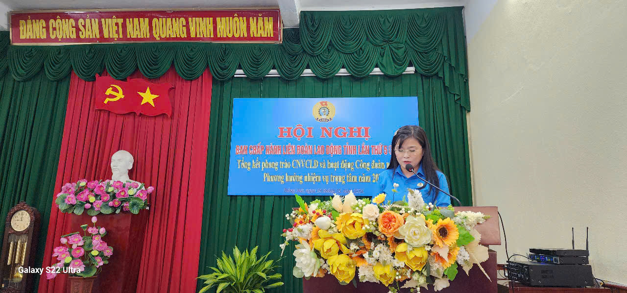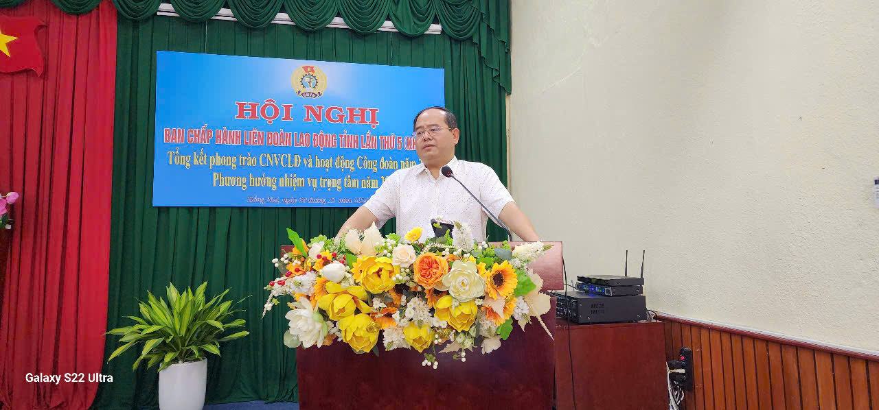 Sáng 20/12/2024, tại Trụ sở làm việc Liên đoàn Lao động (LĐLĐ) tỉnh đã diễn ra Hội nghị Ban Chấp hành LĐLĐ tỉnh lần thứ 5, tổng kết công tác Công đoàn năm 2024 và triển khai chương trình công tác năm 2025. Tham dự hội nghị có các đồng chí: Quản Minh Cường - Phó Bí thư Tỉnh ủy, Trưởng đoàn đại biểu Quốc hội tỉnh; Nguyễn Thị Vẹn - Phó trưởng ban Ban Dân vận Tỉnh ủy; Đoàn Thị Thu Thủy - Phó Bí thư Đảng ủy Khối các cơ quan tỉnh; đại diện các ban đảng, Văn phòng Tỉnh ủy; đại diện Mặt trận Tổ quốc Việt Nam tỉnh và các tổ chức chính trị - xã hội tỉnh.