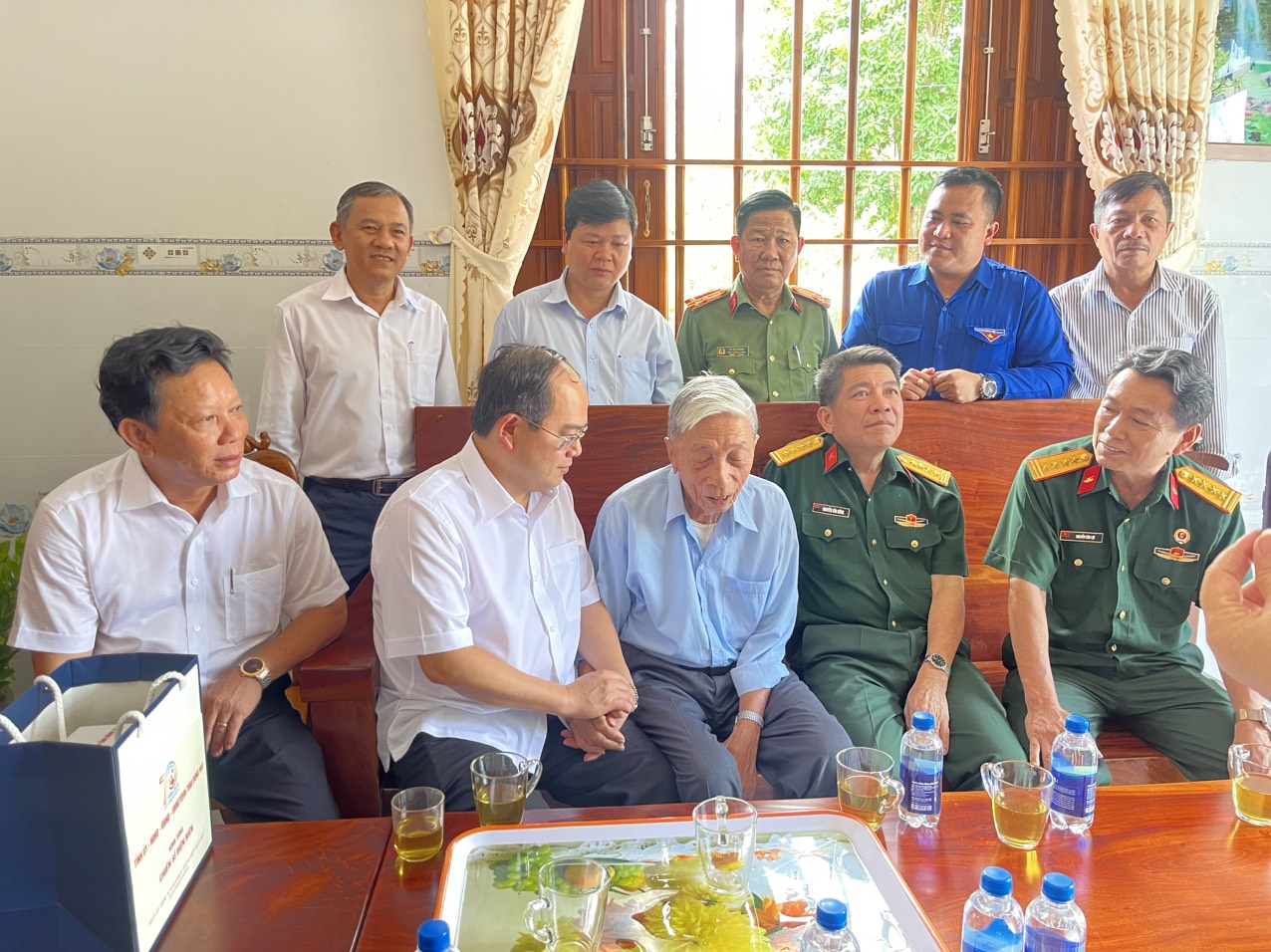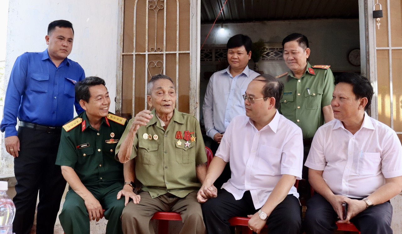Đồng chí Quản Minh Cường – Phó Bí thư Tỉnh ủy, Trưởng Đoàn đại biểu Quốc hội tỉnh thăm, tặng quà cựu thanh niên xung phong cụ Lê Văn Thuông (93 tuổi) ấp 3, xã Suối Cao, huyện Xuân Lộc.