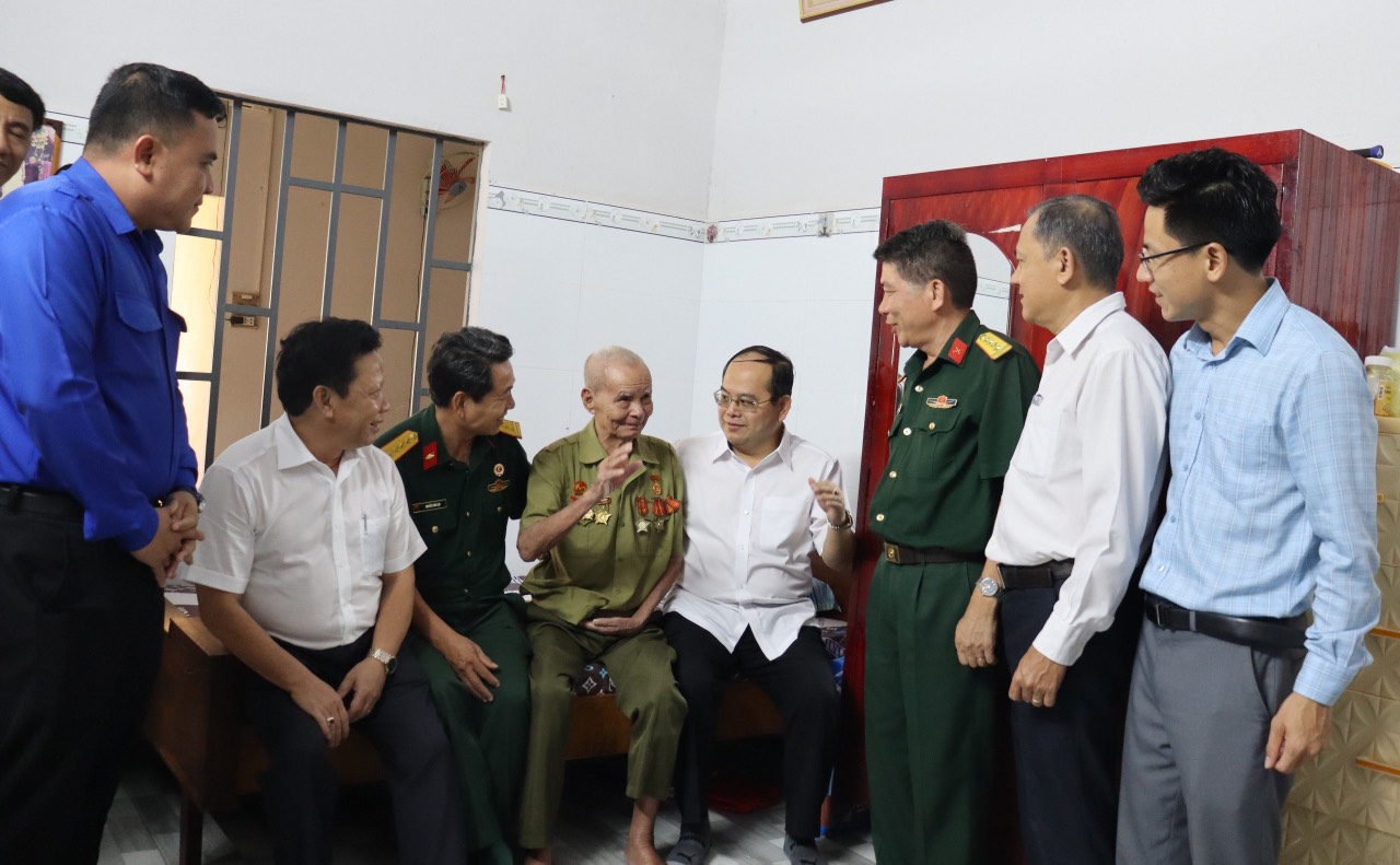 Đồng chí Quản Minh Cường – Phó Bí thư Tỉnh ủy, Trưởng đoàn đại biểu Quốc hội tỉnh thăm, tặng quà cựu Chiến sĩ Điện Biên cụ Đinh Thái Báu, ấp Gia Hòa, xã Xuân Trường