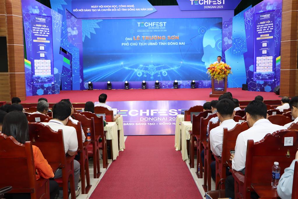 Phát biểu khai mạc, Phó Chủ tịch UBND tỉnh Lê Trường Sơn nhấn mạnh, mục tiêu phát triển của Đồng Nai là tăng trưởng nhanh và bền vững trên nền tảng tri thức – công nghệ – năng lực số. Tỉnh kiên định triển khai đồng bộ ba trụ cột then chốt: khoa học – công nghệ, đổi mới sáng tạo và chuyển đổi số. Trong đó, khoa học công nghệ được xem là nền tảng cốt lõi, tạo động lực nâng cao năng lực cạnh tranh, thúc đẩy phát triển hệ sinh thái khởi nghiệp mở, xây dựng văn hóa đổi mới sáng tạo trong cộng đồng và đẩy mạnh chuyển đổi số trên ba trụ cột: chính quyền số, kinh tế số và xã hội số.