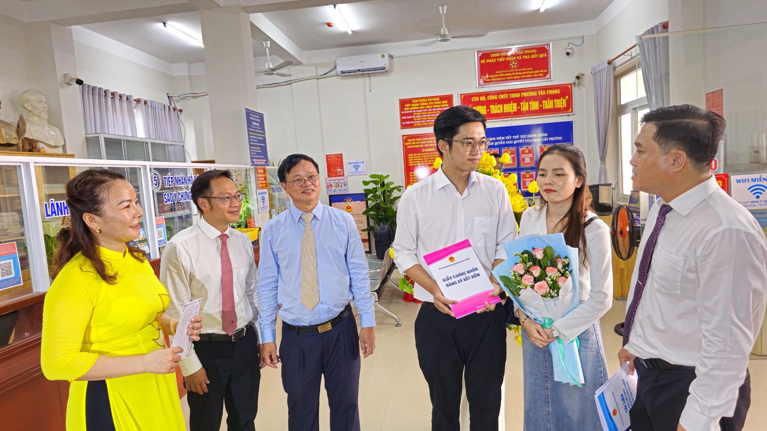 Nhân dịp này, Lãnh đạo Ban Dân vận Tỉnh ủy trao giấy khen và hoa chúc mừng Đảng bộ và Chính quyền phường Tân Phong đã triển khai tốt việc xây dựng và thực hiện mô hình “Chính quyền thân thiện” tại địa phương.