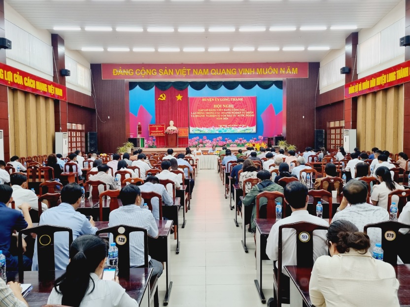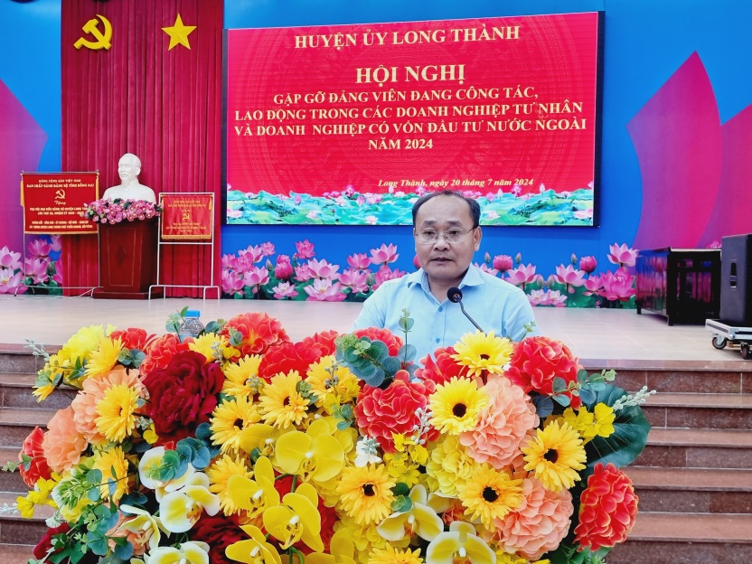 Sáng ngày 20/7/2024, Ban Thường vụ Huyện ủy Long Thành tổ chức hội nghị gặp gỡ đảng viên đang công tác, lao động trong các doanh nghiệp tư nhân và doanh nghiệp có vốn đầu tư nước ngoài. Dự lễ có các đồng chí: Huỳnh Thị Thanh Hà, Trưởng Phòng Tổ chức đảng, đảng viên - Ban Tổ chức Tỉnh ủy; Huỳnh Minh Dũng - Phó Bí thư Thường trực Huyện ủy, Chủ tịch HĐND huyện, Nguyễn Hữu Thành - UVTV, Phó Chủ tịch UBND huyện, đại diện Lãnh đạo các Ban Đảng, Văn phòng Huyện ủy, các phòng, ban, ngành, Mặt trận Tổ quốc, các tổ chức chính trị - xã hội huyện cùng toàn thể đảng viên đang công tác trong các doanh nghiệp tư nhân và doanh nghiệp có vốn đầu tư nước ngoài trên địa bàn.