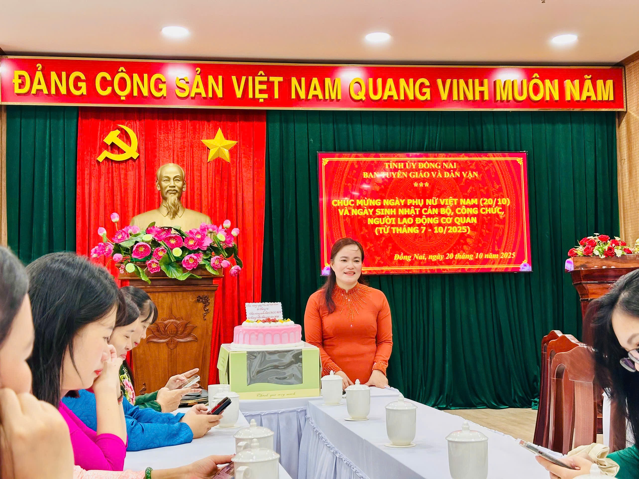 Sáng 20-10, Ban Tuyên giáo và Dân vận Tỉnh ủy Đồng Nai tổ chức buổi gặp mặt thân mật nhằm tôn vinh những đóng góp của đội ngũ nữ cán bộ, công chức, người lao động nhân Ngày Phụ nữ Việt Nam 20-10; đồng thời kết hợp chúc mừng sinh nhật cho các cán bộ, công chức có ngày sinh trong quý III năm 2025.