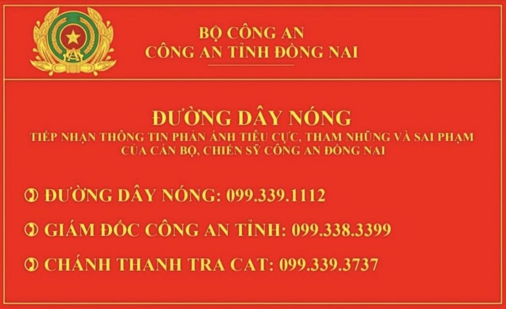 Thường xuyên kiểm tra, đôn đốc việc niêm yết công khai số điện thoại đường dây nóng của Công an tỉnh và của đồng chí Giám đốc Công an tỉnh, đồng chí Chánh Thanh tra Công an tỉnh để tiếp nhận thông tin phản ánh tiêu cực, tham nhũng và sai phạm của cán bộ, chiến sĩ Công an tỉnh tại địa điểm tiếp công dân của Công an các đơn vị, địa phương (trong đó có Công an cấp xã) và trên phương tiện tuần tra kiểm soát của lực lượng Cảnh sát giao thông - trật tự, giúp Nhân dân kịp thời phản ánh, góp ý, kiến nghị các vấn đề liên quan đến cán bộ, chiến sĩ Công an tỉnh, nhằm góp phần xây dựng lực lượng Công an tỉnh Đồng Nai thật sự trong sạch, vững mạnh, chính quy, tinh nhuệ, hiện đại.