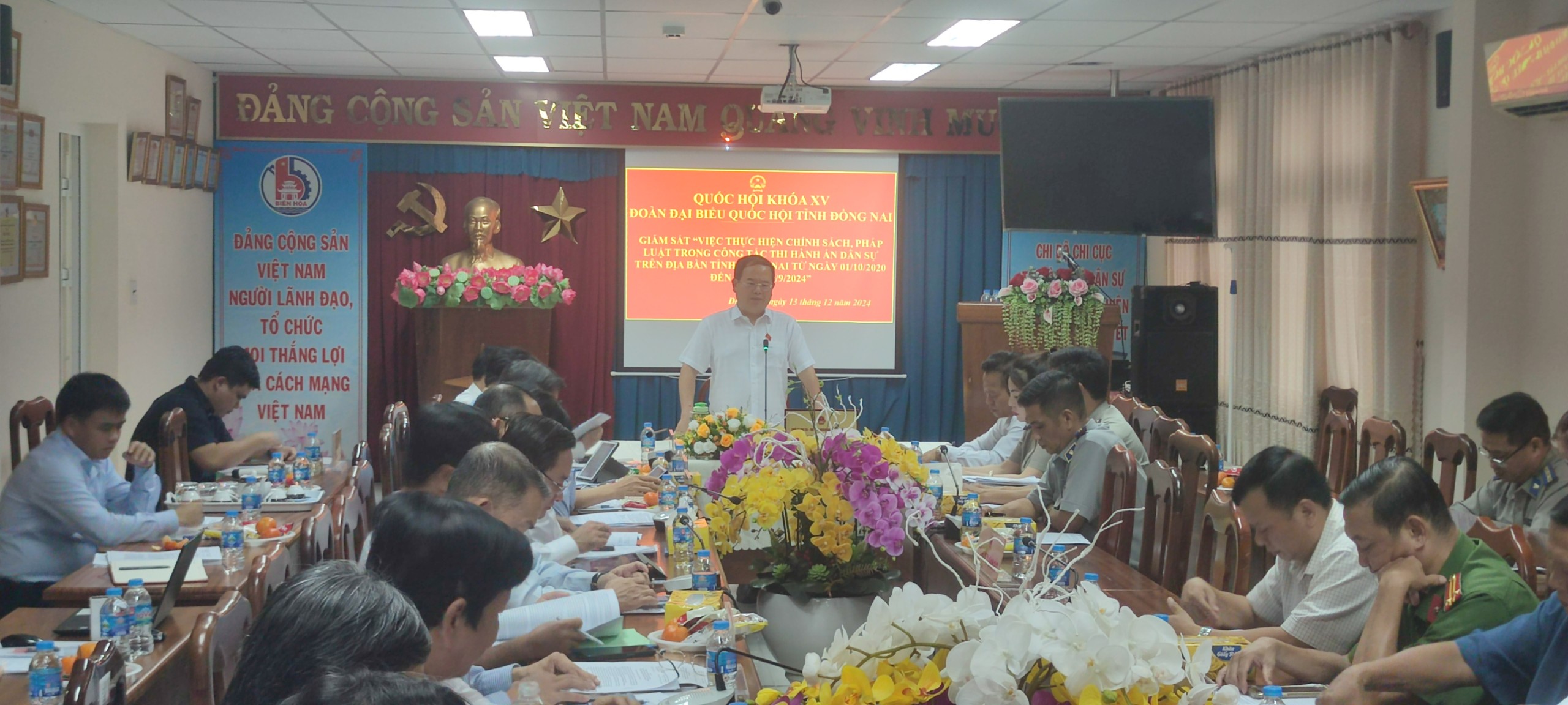 Thực hiện chương trình giám sát của Đoàn đại biểu Quốc hội (ĐBQH) tỉnh Đồng Nai, chiều ngày 13/12/2024, Đoàn giám sát do đồng chí Quản Minh Cường, Phó Bí thư Tỉnh ủy, Trưởng Đoàn ĐBQH tỉnh, Trưởng đoàn đã giám sát trực tiếp đối với Chi cục THADS thành phố Biên Hòa về thực hiện chính sách, pháp luật trong công tác THADS trên địa bàn từ ngày 01/10/2020 đến ngày 30/9/2024. Tham gia đoàn giám sát có các đồng chí ĐBQH: Nguyễn Công Long - Ủy viên Thường trực Ủy ban Tư pháp của Quốc hội; Lê Hoàng Hải - Ủy viên chuyên trách Ủy ban Khoa học, Công nghệ và Môi trường của Quốc hội; Bùi Xuân Thống, TUV, Phó Trưởng Đoàn ĐBQH tỉnh; Nguyễn Sơn Hùng, TUV, Phó Chủ tịch UBND tỉnh; đại diện lãnh đạo các ban đảng Tỉnh ủy, các sở, ngành, Mặt trận Tổ quốc Việt Nam tỉnh.