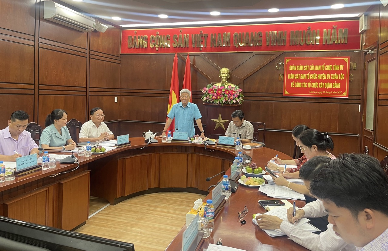 Ngày 08/8/2024, Đoàn Giám sát số 1 của Ban Tổ chức Tỉnh ủy do đồng chí Nguyễn Thanh Tú - TUV, Phó Trưởng Ban Tổ chức Tỉnh ủy - Trưởng Đoàn tiến hành giám sát công tác tổ chức XDĐ, công tác chuẩn bị đại hội cấp cơ sở và trên cơ sở đối với Ban Tổ chức Huyện ủy Xuân Lộc. Về phía Huyện ủy Xuân Lộc có đồng chí Lê Kim Bằng - TUV, Bí thư Huyện ủy; cùng các cán bộ và chuyên viên Ban Tổ chức Huyện ủy.
