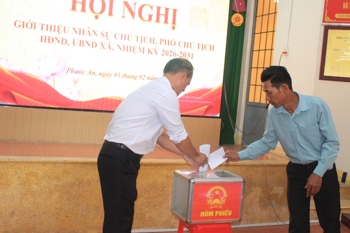 Các đồng chí cán bộ chủ chốt bỏ phiếu giới thiệu nhân sự tái cử các chức danh Chủ tịch, Phó Chủ tịch HĐND, UBND xã Phước An, nhiệm kỳ 2026-2031