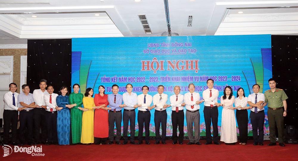 Lãnh đạo tỉnh bắt tay động viên tinh thần ngành GD-ĐT và các sở, ngành cùng phấn đấu, thi đua hoàn thành nhiệm vụ năm học 2023-2024 (Ảnh Báo Đồng Nai)