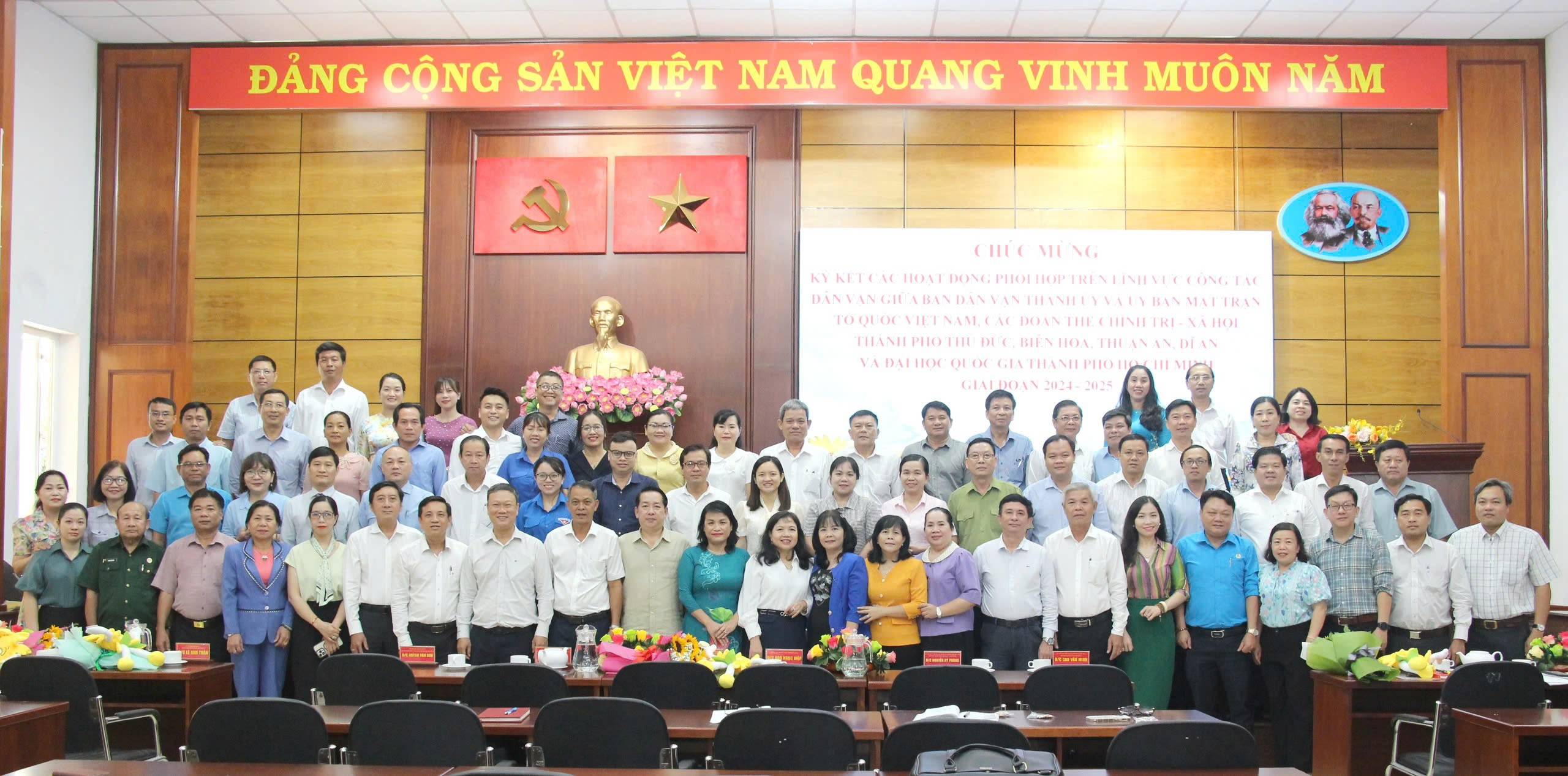 Ngày 09/10/2024, tại Thành ủy thành phố Thủ Đức (Thành phố Hồ Chí Minh) đã diễn ra hội nghị ký kết các hoạt động phối hợp trên lĩnh vực CTDV giữa Ban Dân vận Thành ủy, Ủy ban MTTQ Việt Nam, các tổ chức chính trị - xã hội thành phố Thủ Đức, Biên Hòa (tỉnh Đồng Nai), Thuận An, Dĩ An (tỉnh Bình Dương) và Đại học Quốc gia Thành phố Hồ Chí Minh, giai đoạn 2024-2025.