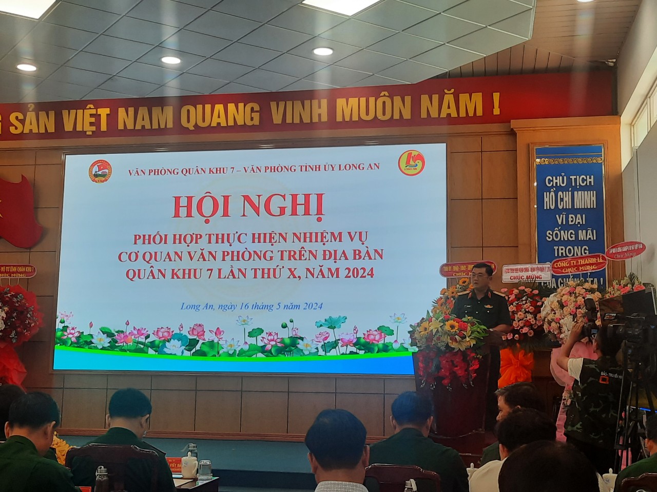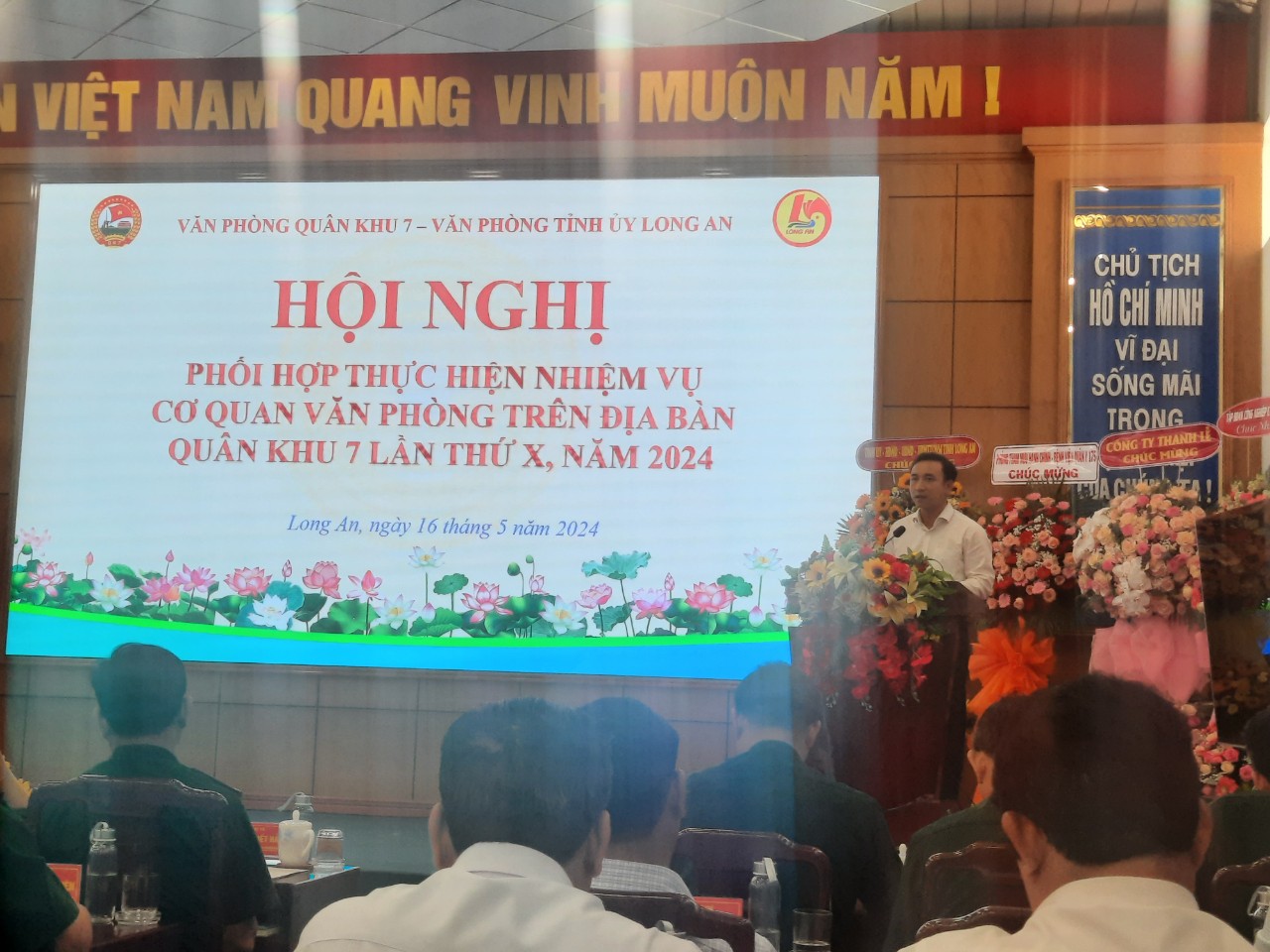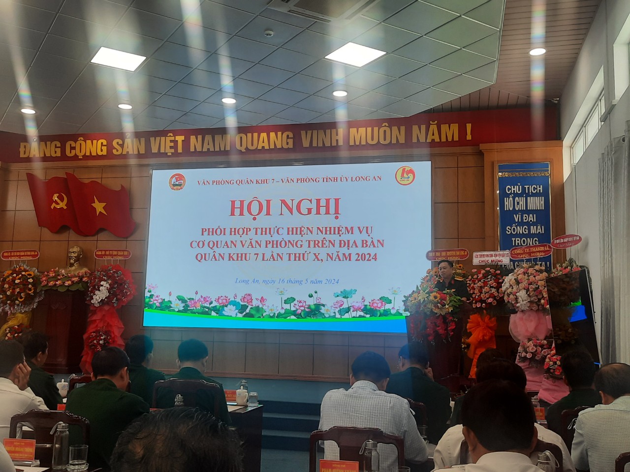 Ngày 16/5/2024, tại Hội trường Tỉnh ủy Long An, Văn phòng Quân Khu 7 phối hợp với Văn phòng Tỉnh ủy Long An tổ chức Hội nghị phối hợp thực hiện nhiệm vụ cơ quan Văn phòng trên địa bàn Quân Khu 7, lần thứ X năm 2024. Tham dự hội nghị đồng chí Thiếu tướng Lê Xuân Thế, Phó Tư lệnh Quân khu 7; đồng chí Nguyễn Thanh Hải, Phó Bí thư Thường trực Tỉnh ủy, Trưởng Đoàn đại biểu Quốc hội tỉnh Long An; Thủ trưởng các cơ quan, đơn vị lực lượng vũ trang Quân khu; lãnh đạo Văn phòng tỉnh (thành) ủy, Văn phòng Đoàn đại biểu Quốc hội và Hội đồng nhân dân, Văn phòng Ủy ban nhân dân 9 tỉnh, thành phố trên địa bàn miền Đông Nam Bộ; đại diện lãnh đạo Văn phòng Quốc hội, Bộ Công an, Bộ Tư lệnh Cảnh vệ; các đơn vị kết nghĩa, cơ quan, đơn vị, doanh nghiệp đồng hành với lực lượng vũ trang Quân khu trong thực hiện nhiệm vụ quân sự, quốc phòng…Về phía Văn phòng Tỉnh ủy Đồng Nai có đồng chí Nguyễn Xuân Cường, Phó Chánh Văn phòng Tỉnh ủy tham dự.