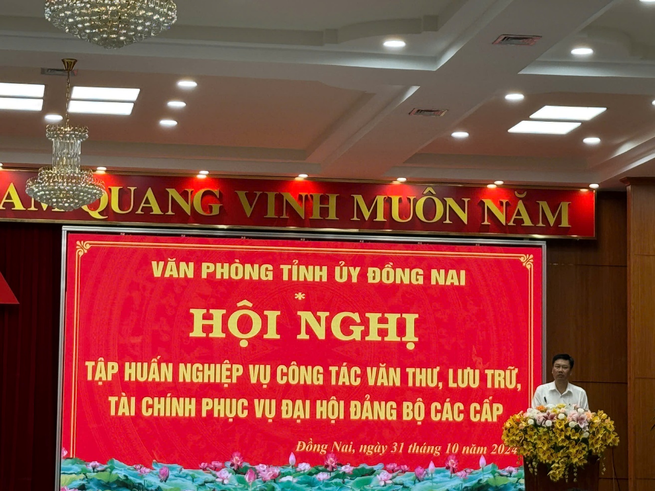 Phát biểu khai mạc, đồng chí Viên Hồng Tiến, TUV, Chánh Văn phòng Tỉnh ủy Đồng Nai đã nêu rõ Công tác văn thư, lưu trữ có vai trò rất quan trọng đối với hoạt động của các cơ quan, tổ chức đảng, tổ chức chính trị - xã hội. Vì vậy, Đảng và Nhà nước ban hành rất nhiều văn bản quy phạm pháp luật và luôn quan tâm chỉ đạo, hướng dẫn nghiệp vụ về công tác văn thư, lưu trữ và tài liệu lưu trữ. Công tác văn thư, lưu trữ là các công tác quan trọng không thể thiếu trong hoạt động của các cấp ủy, cơ quan, tổ chức đảng, trong đó có đại hội đảng bộ các cấp, bảo đảm cung cấp thông tin từ văn bản phục vụ đại hội; bảo đảm sự thành công của đại hội. Làm tốt công tác văn thư, lưu trữ phục vụ đại hội bảo đảm cung cấp đầy đủ thông tin, góp phần nâng cao năng suất, chất lượng công tác của cơ quan, tổ chức trong công tác chuẩn bị, tổ chức và phục vụ đại hội đảng. Đồng chí Chánh Văn phòng Tỉnh ủy yêu cầu các đồng chí tham gia lớp tập huấn tập trung tiếp thu, chủ động nghiên cứu tài liệu, đồng thời, tích cực trao đổi, thảo luận, nêu những vướng mắc, khó khăn trong thực tế tại cơ quan, đơn vị để các đồng chí báo cáo viên giải đáp.
