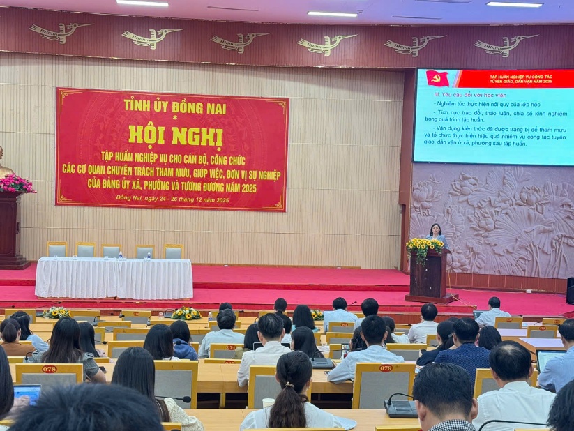 Từ ngày 24 đến 26-12, Tỉnh ủy Đồng Nai tổ chức Hội nghị tập huấn nghiệp vụ cho đội ngũ cán bộ, công chức đang công tác tại các cơ quan tham mưu, giúp việc của Đảng ủy cấp cơ sở. Trong khuôn khổ hội nghị, Ban Tuyên giáo và Dân vận Tỉnh ủy triển khai nội dung tập huấn chuyên sâu về công tác Tuyên giáo và Dân vận, một trong những nội dung trọng tâm của chương trình.