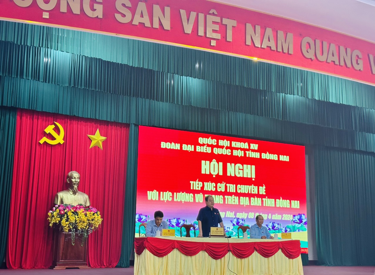Thực hiện Kế hoạch số 05/KH-ĐĐBQH, ngày 15/3/2024 của Đoàn đại biểu Quốc hội tỉnh Đồng Nai, sáng ngày 08/4/2024, tại Hội trường Bộ Chỉ huy Quân sự (CHQS) tỉnh, Đoàn đại biểu Quốc hội tỉnh Đồng Nai tổ chức Hội nghị tiếp xúc cử tri chuyên đề với LLVT trên địa bàn tỉnh Đồng Nai.
