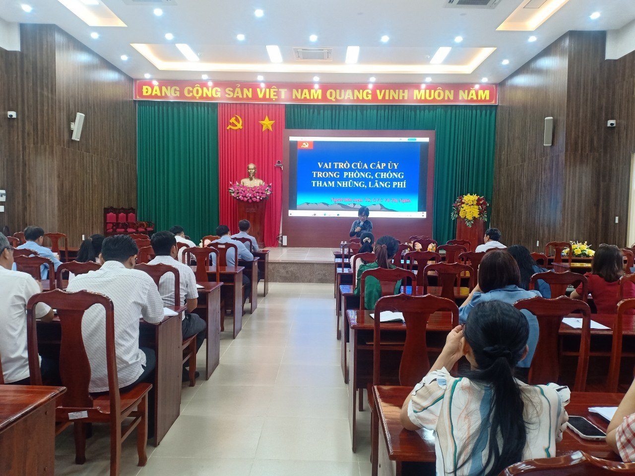 Trong thời gian 01 ngày, các học viên sẽ được nghe Tiến sĩ Vũ Thị Nghĩa, Phó Hiệu trưởng Trường Chính trị tỉnh triển khai chuyên đề “Vai trò của cấp ủy trong phòng, chống tham nhũng, lãng phí”; đồng chí Lê Minh Đức - Kế toán Văn phòng Huyện ủy triển khai Hướng dẫn thu, chi Đảng phí và đồng chí Nguyễn Hữu Chiến, HUV, Chánh Văn phòng Huyện ủy hướng dẫn Công tác tham mưu văn bản của Đảng.